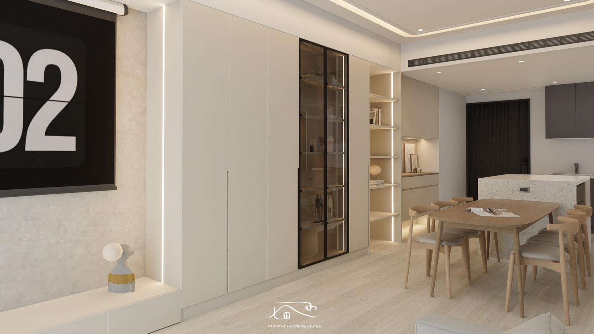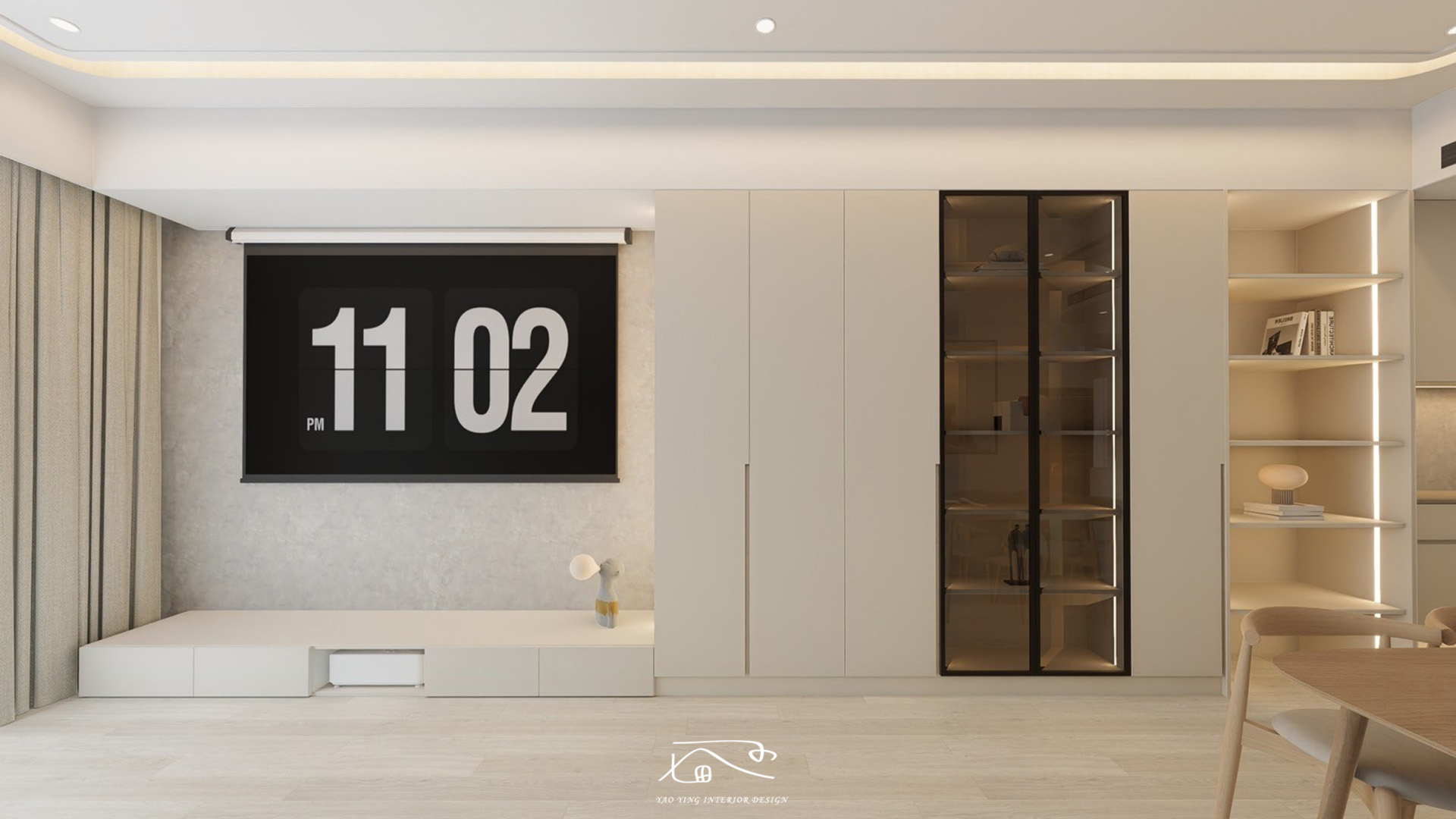 在電視牆的設計採用落地式電視櫃,提升視覺上的延展性,讓空間顯得更加寬敞;由於屋主產業是販售精品包,所以在收納櫃也刻意設計了玻璃櫃以及開放櫃來滿足產品展示和拍照的需求,同時也讓視覺感不會過於壓迫。