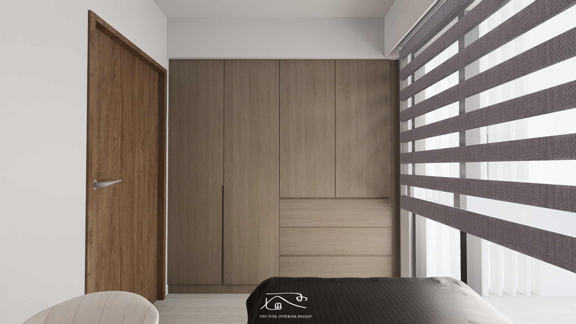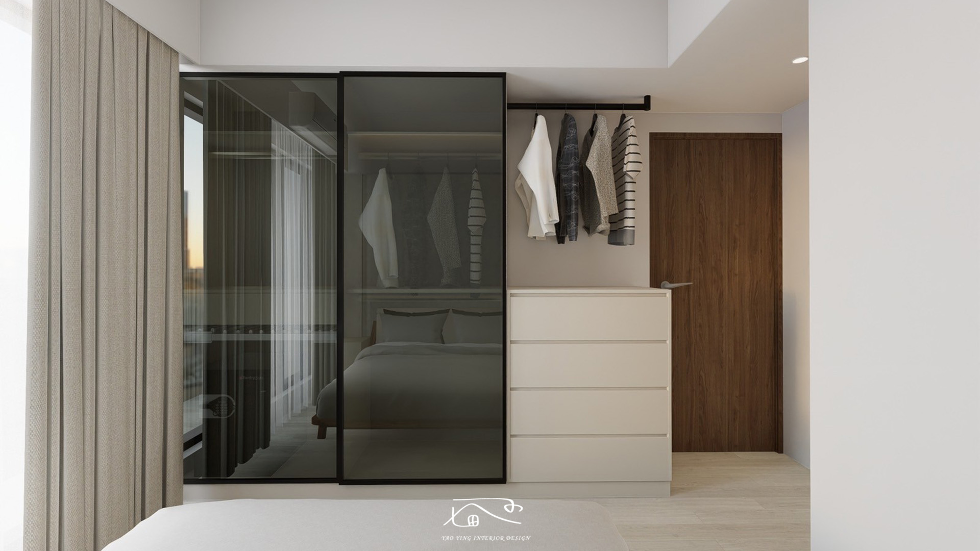 在主臥入口處設計了一組開放吊衣桿,方便吊掛短期內需重複穿著的衣物,下方配置抽屜收納貼身衣物,在衣櫥則採用玻璃門片,讓空間上減少壓迫感。