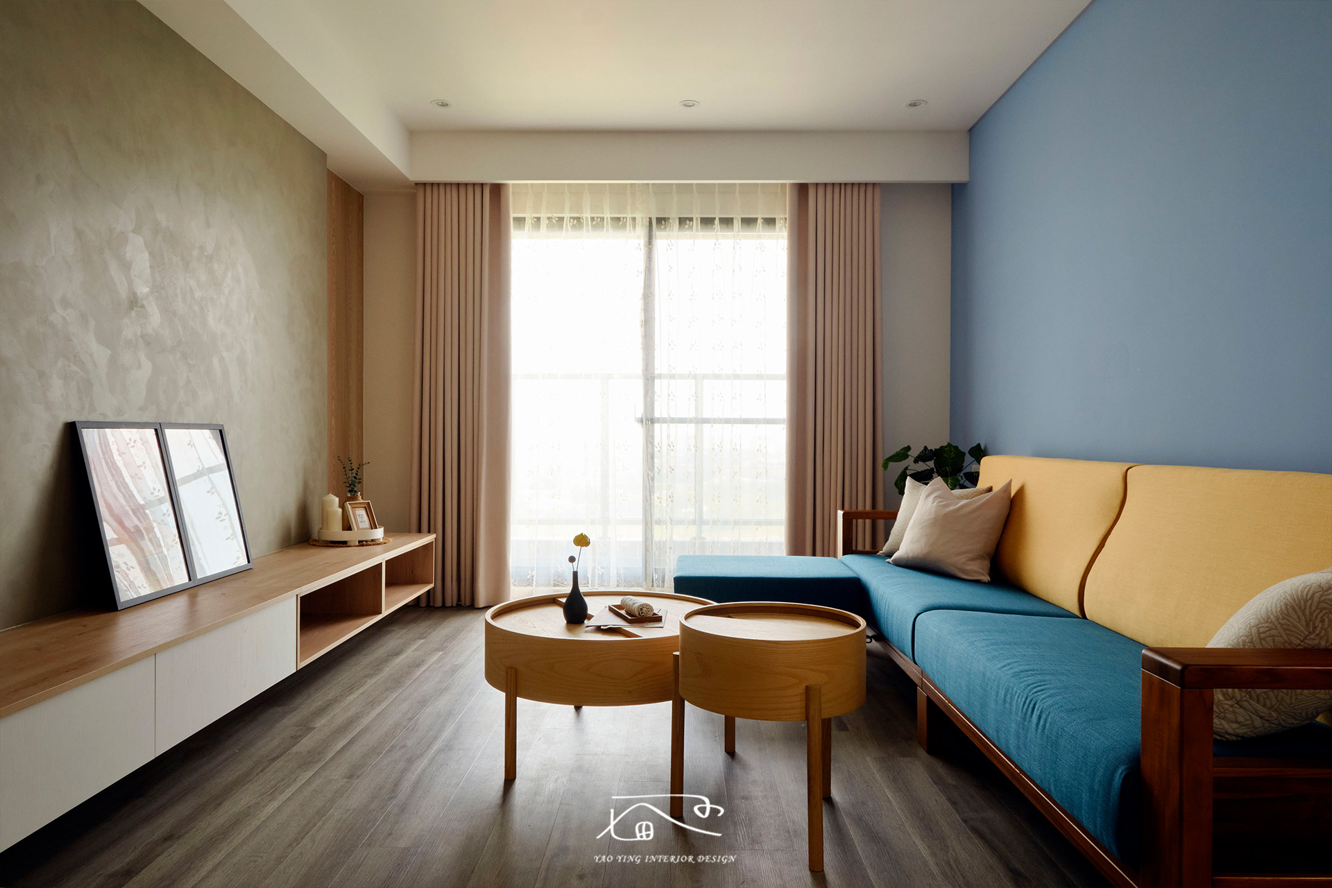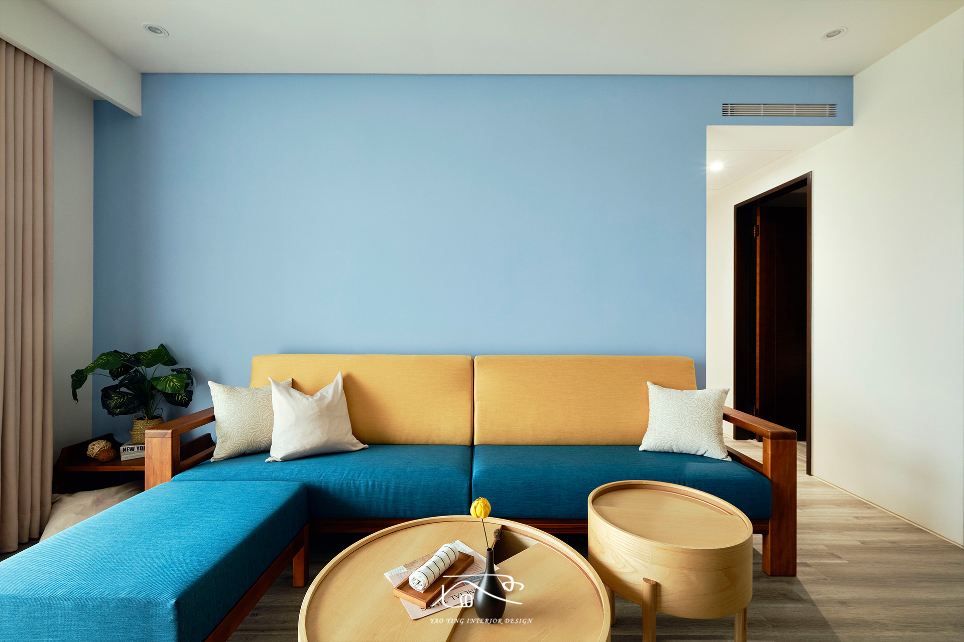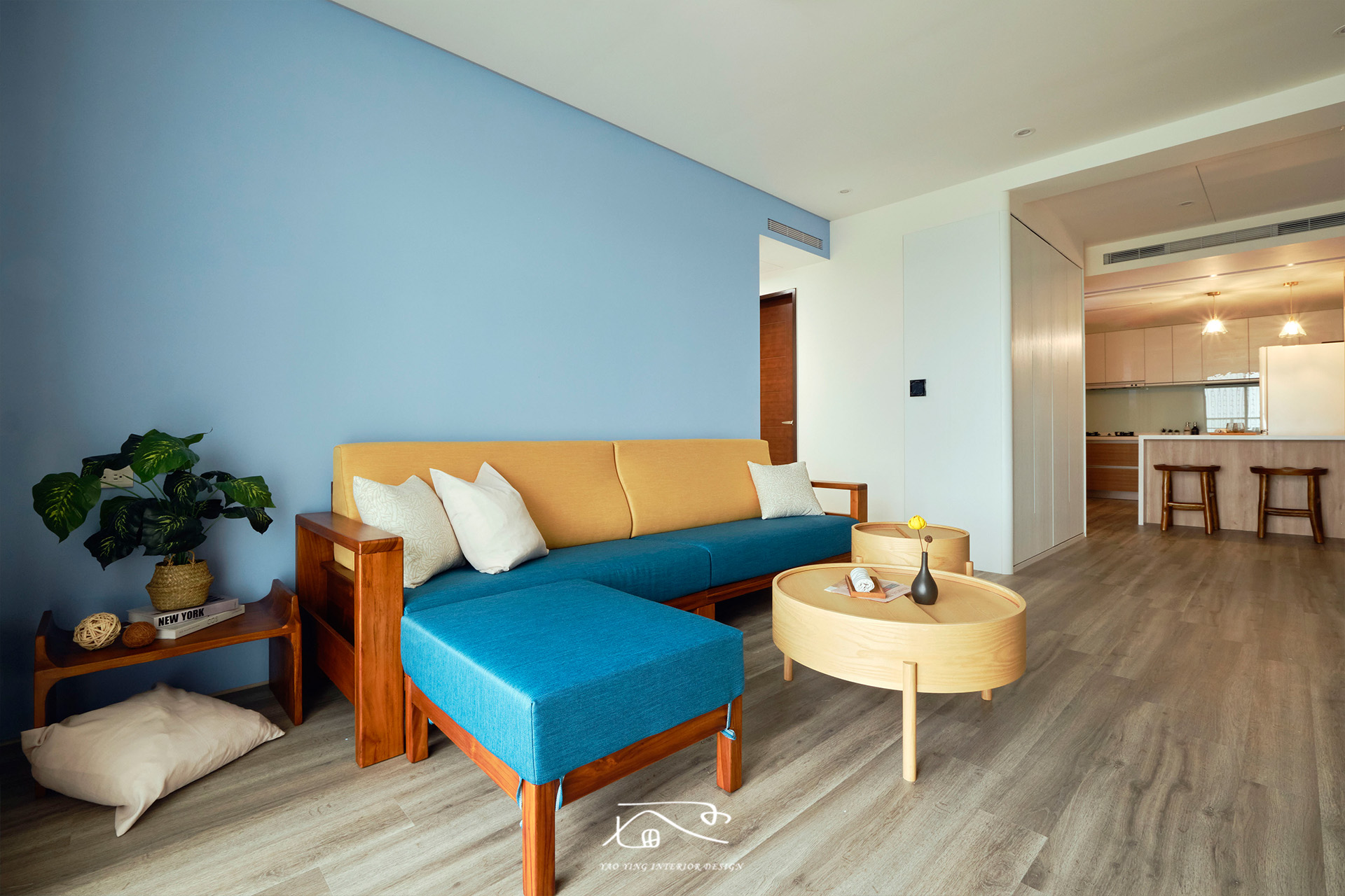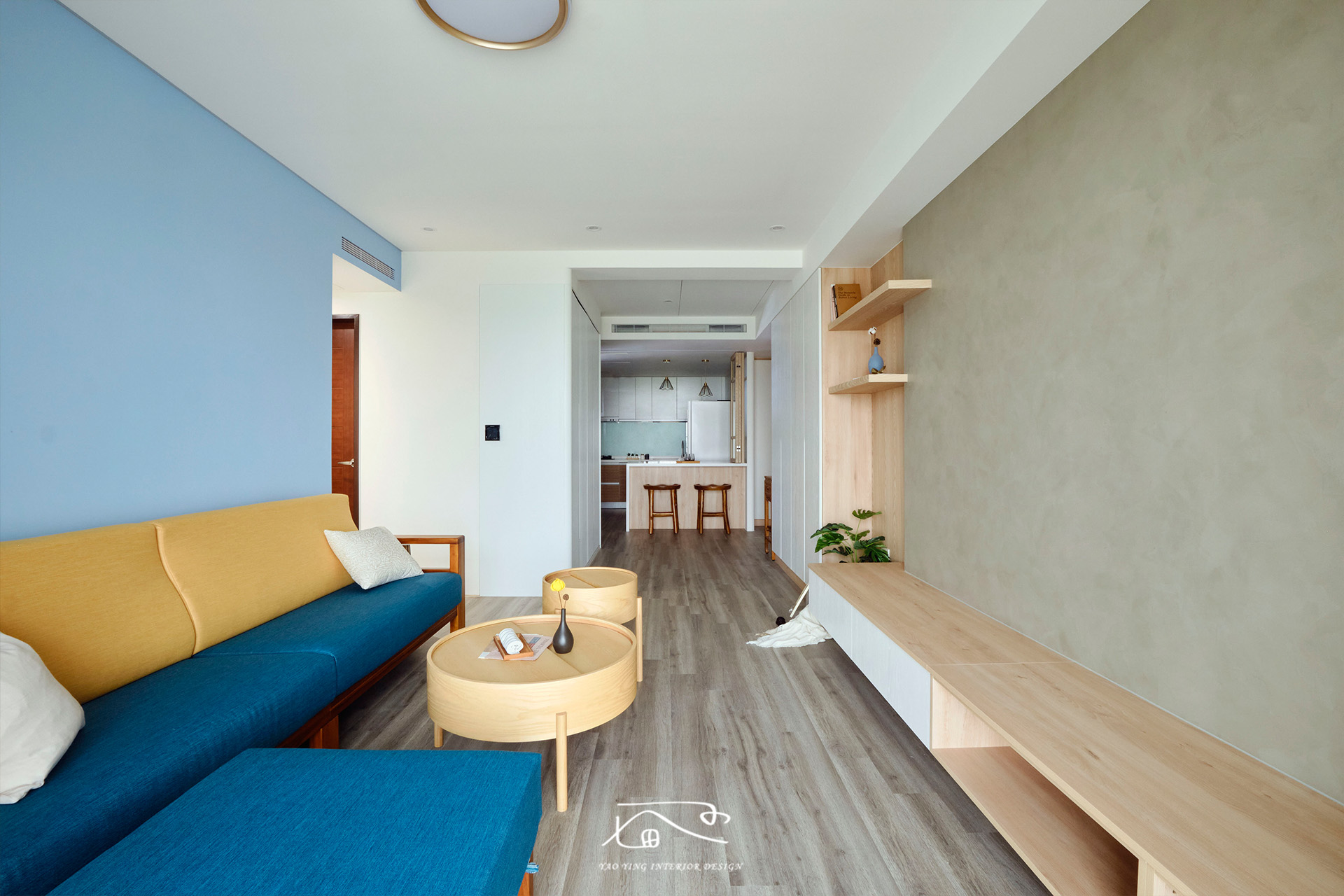 客廳使用了不少色彩,電視牆的特殊漆、沙發牆的水藍色、原木家具,再加上屋主挑的繽紛沙發。原以為過多的顏色會太衝突,但在燈光和軟裝的搭配下,卻意外有種和諧感,讓人彷彿置身度假空間,一天的疲憊都在這裡被慢慢卸下。