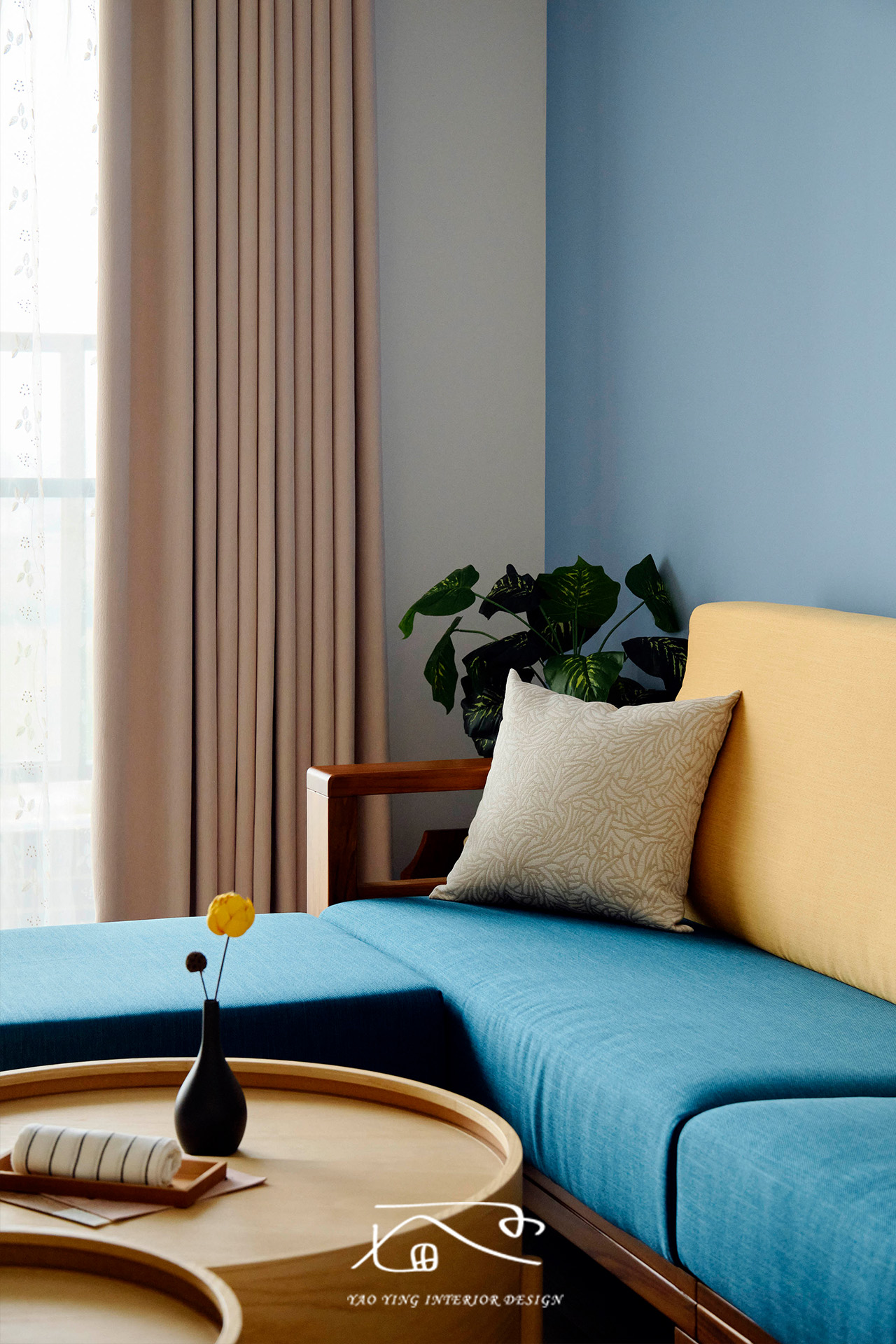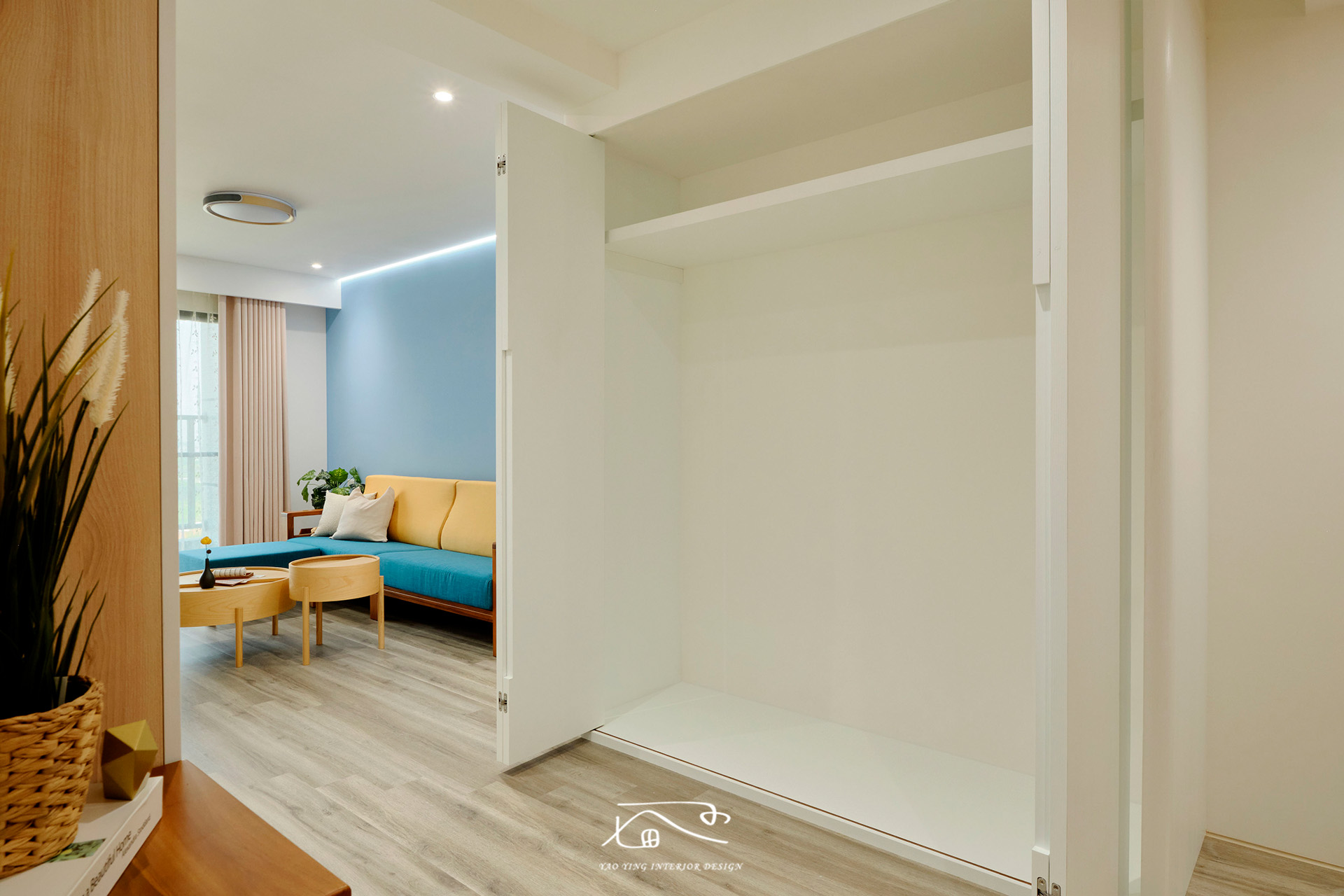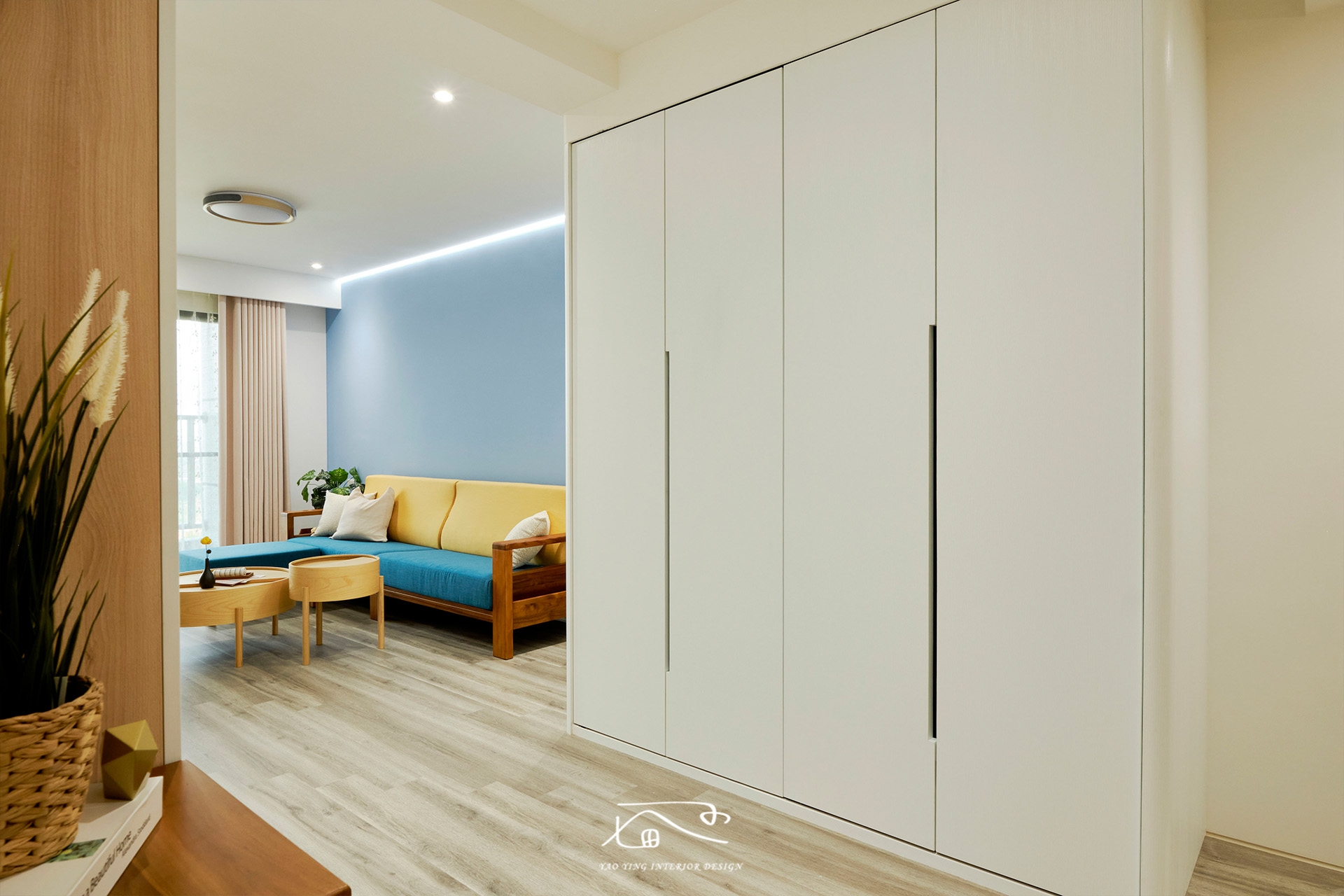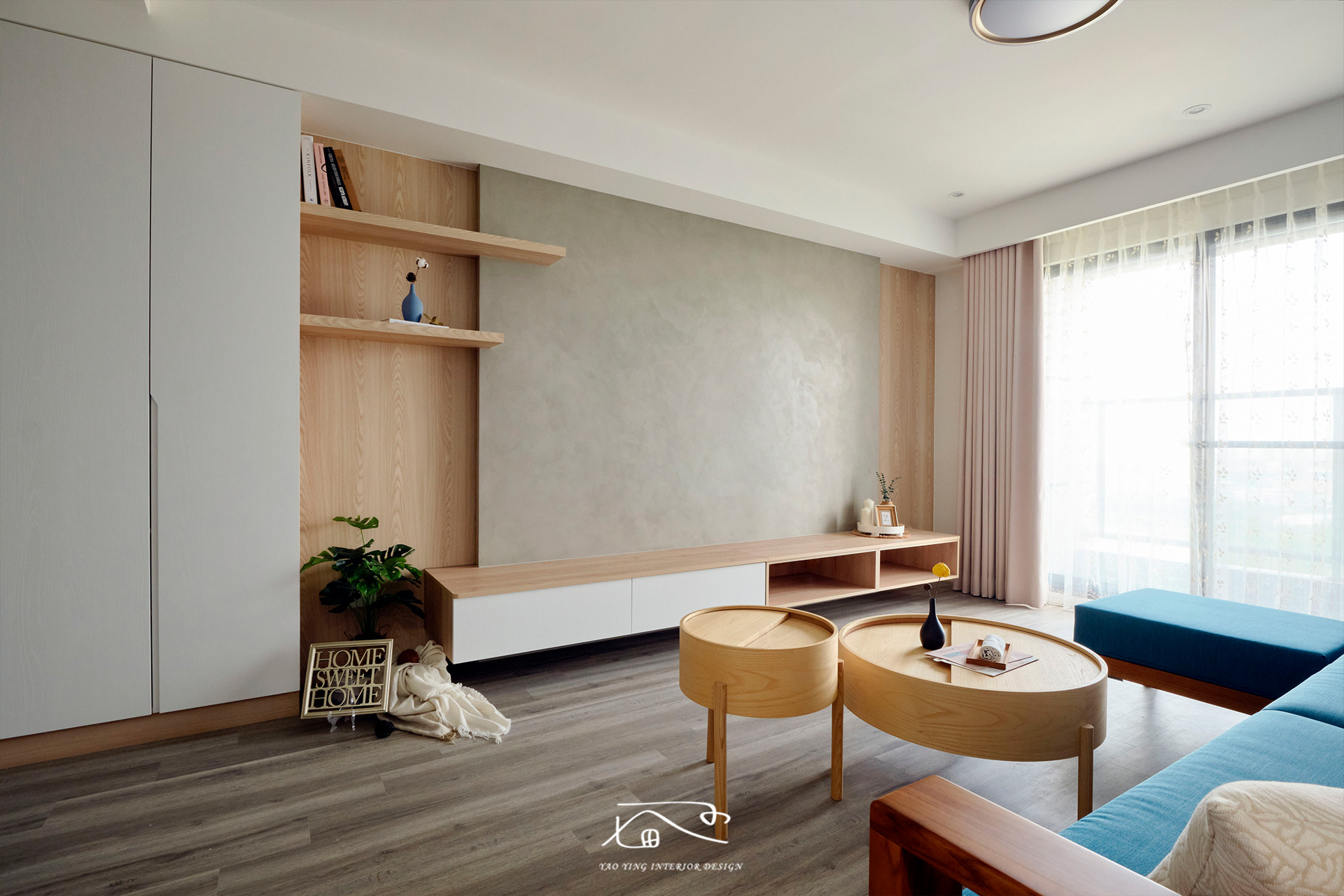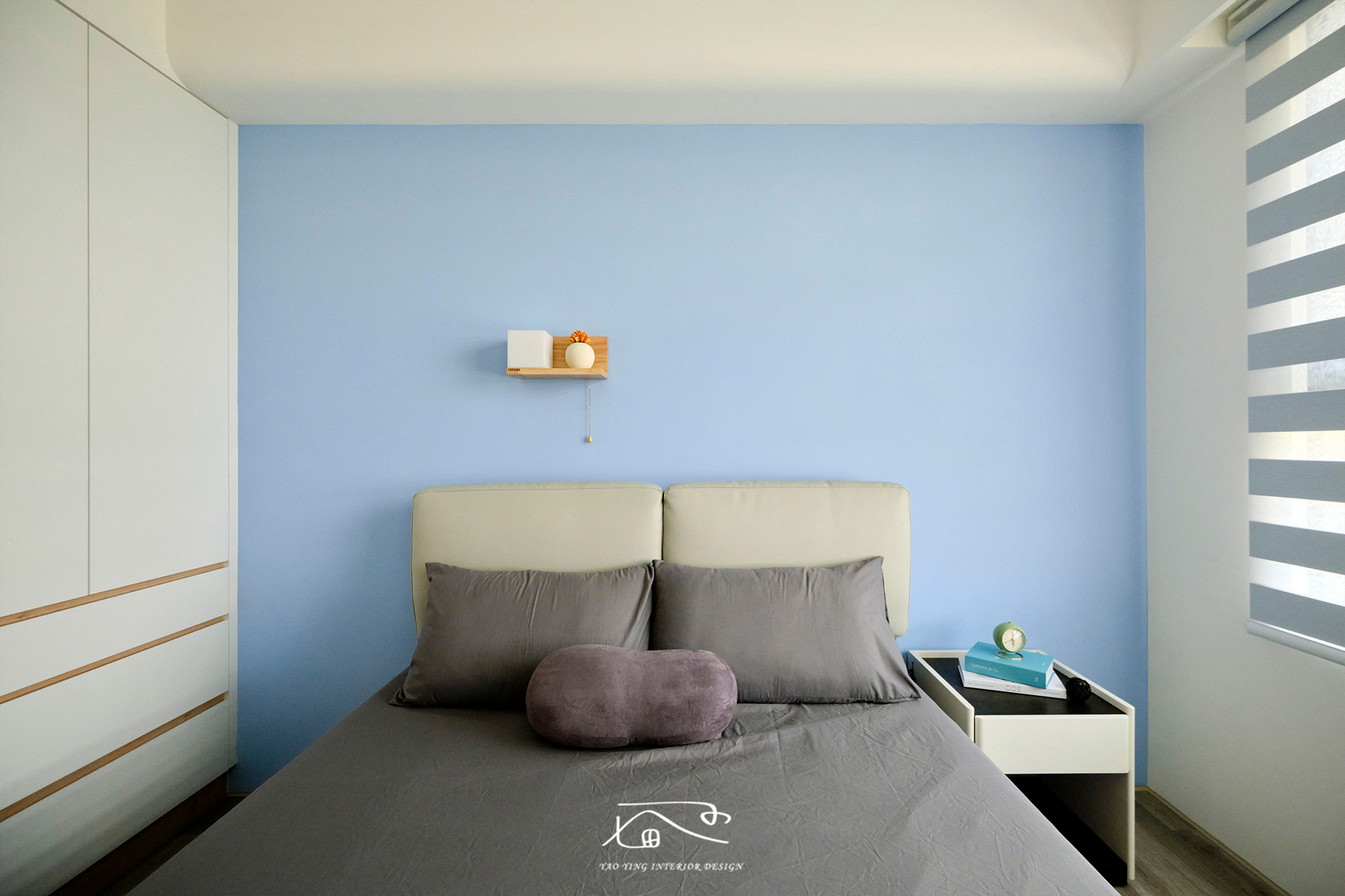 客廳使用了不少色彩,電視牆的特殊漆、沙發牆的水藍色、原木家具,再加上屋主挑的繽紛沙發。原以為過多的顏色會太衝突,但在燈光和軟裝的搭配下,卻意外有種和諧感,讓人彷彿置身度假空間,一天的疲憊都在這裡被慢慢卸下。