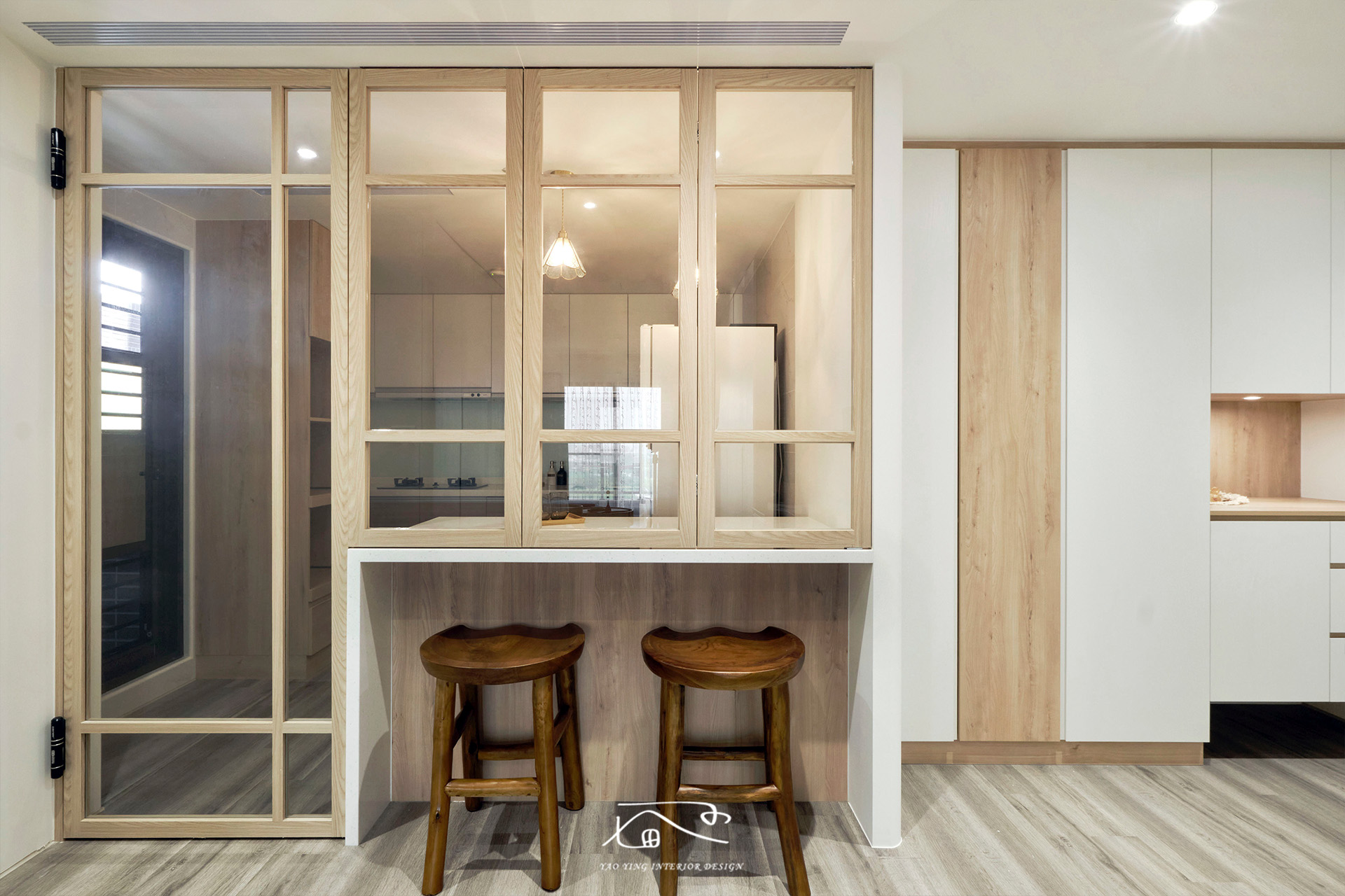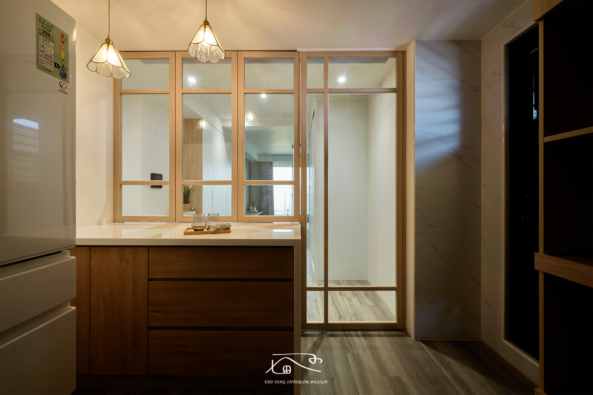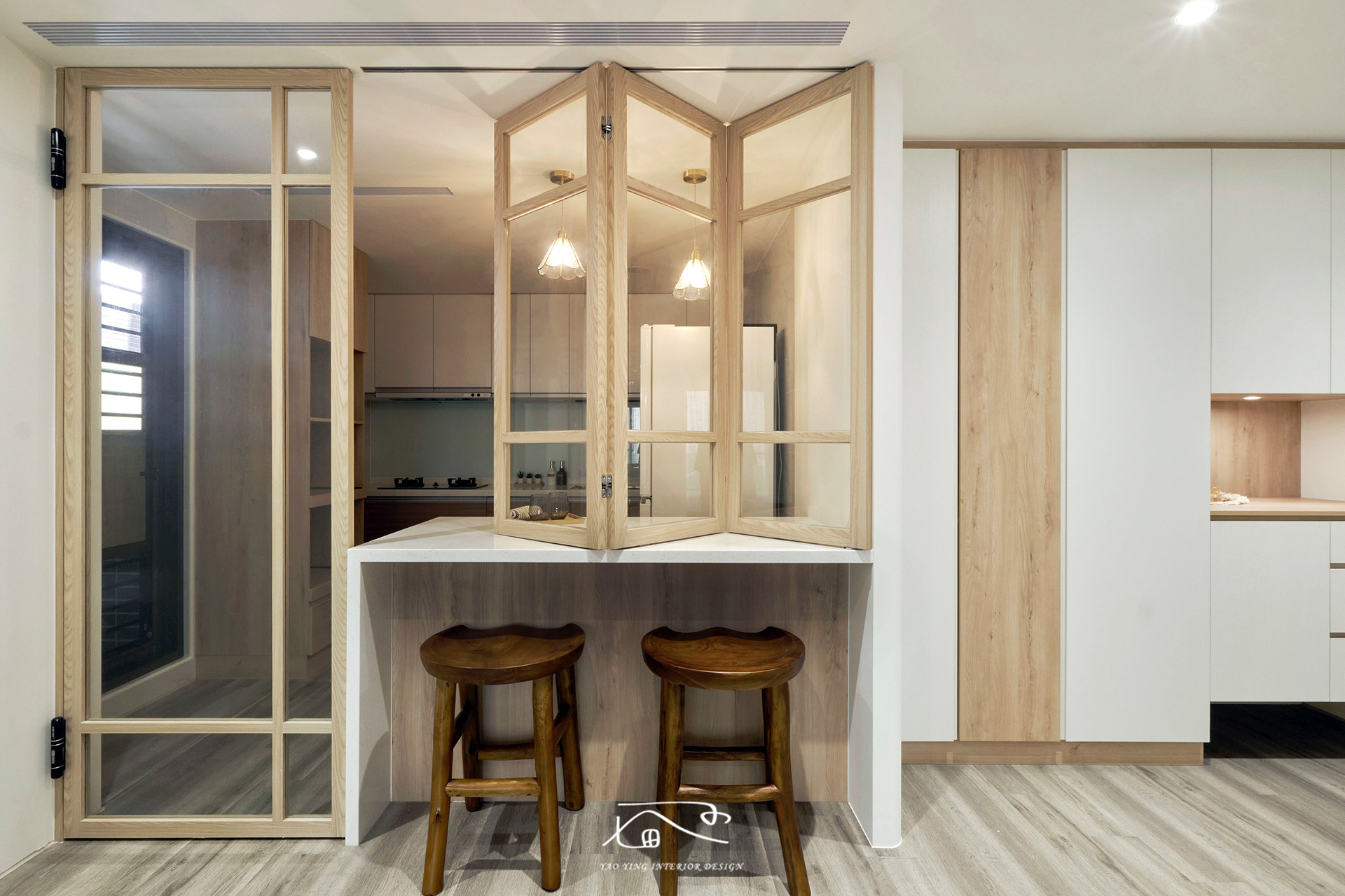 吧檯結合拉門設計,平時可以全展讓空間更有通透性,更是一家人和親友同樂的聚集地,一家人圍坐吧檯旁,談笑風生;甚至是近來流行的「立吞」,都成為日常裡最有溫度的風景。