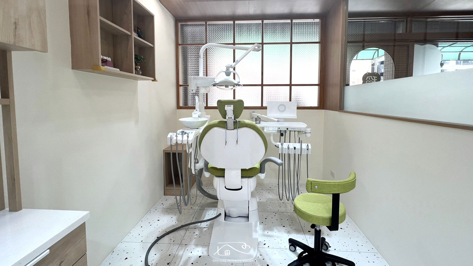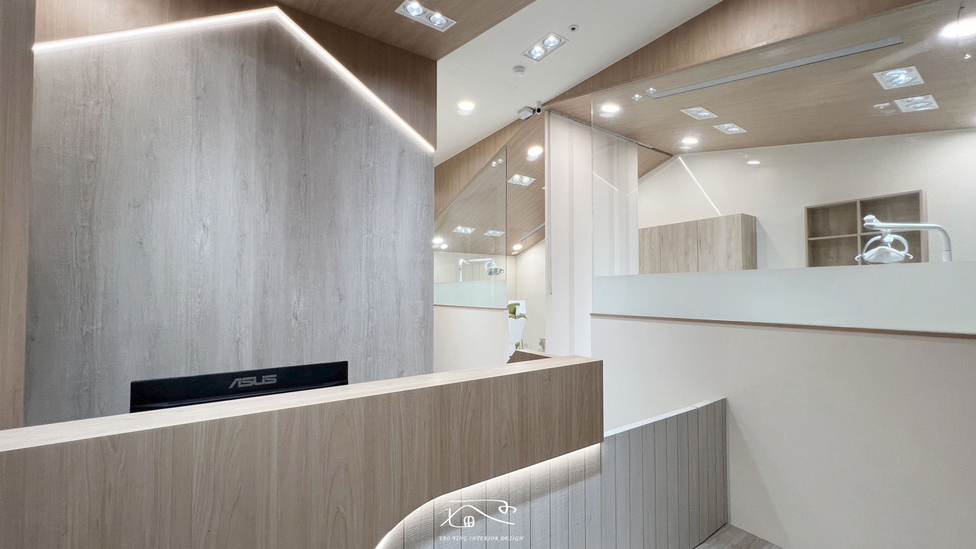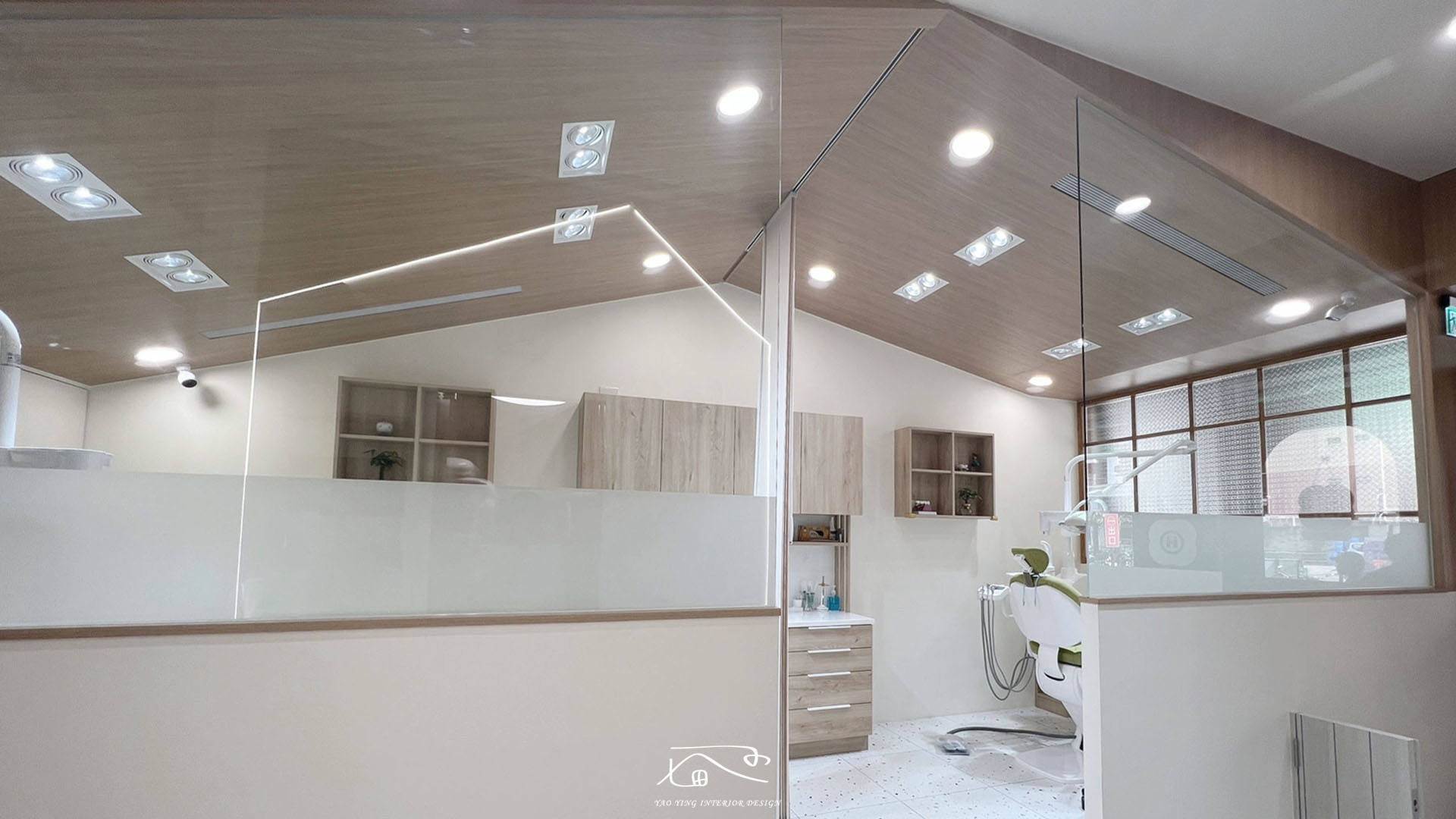 在整體的空間設計規劃上,大量採用造型玻璃加上貼膜,讓看診環境通透同時保有病患的隱私性。
