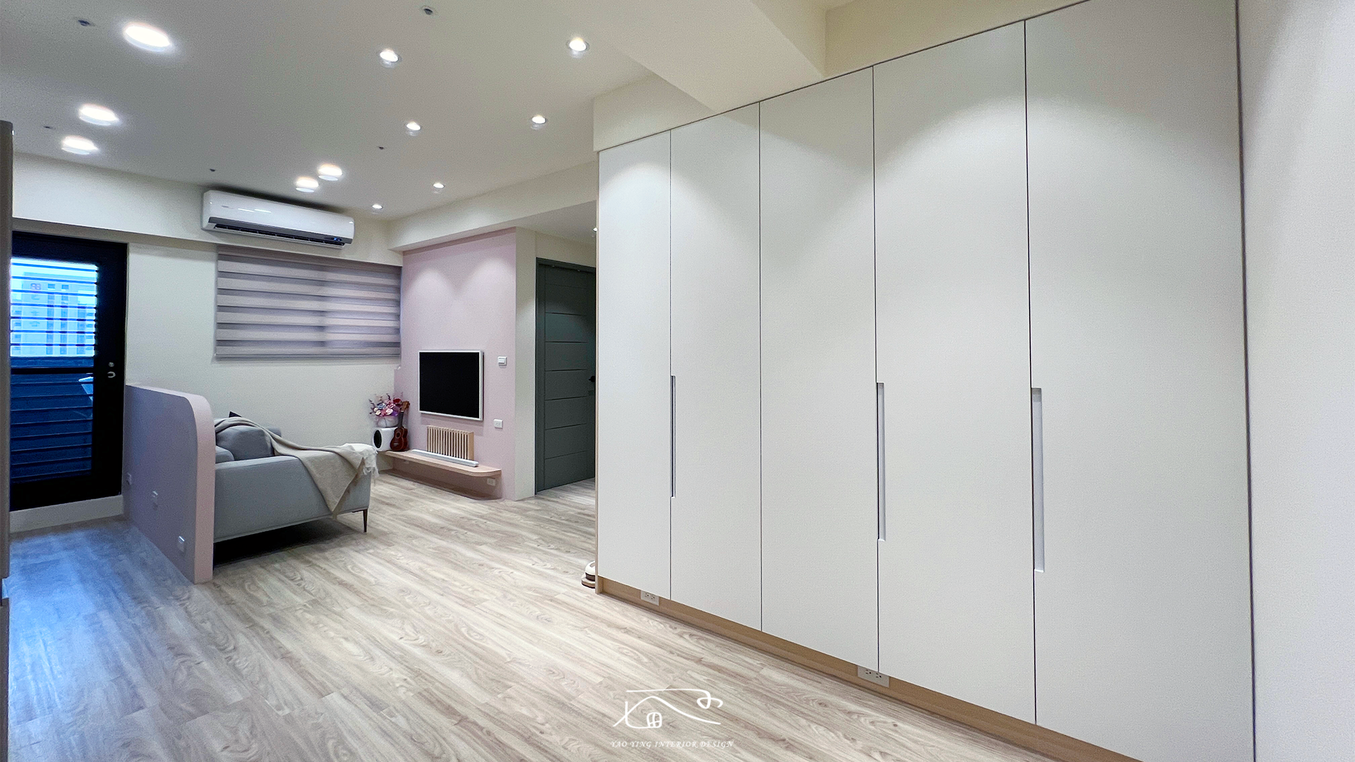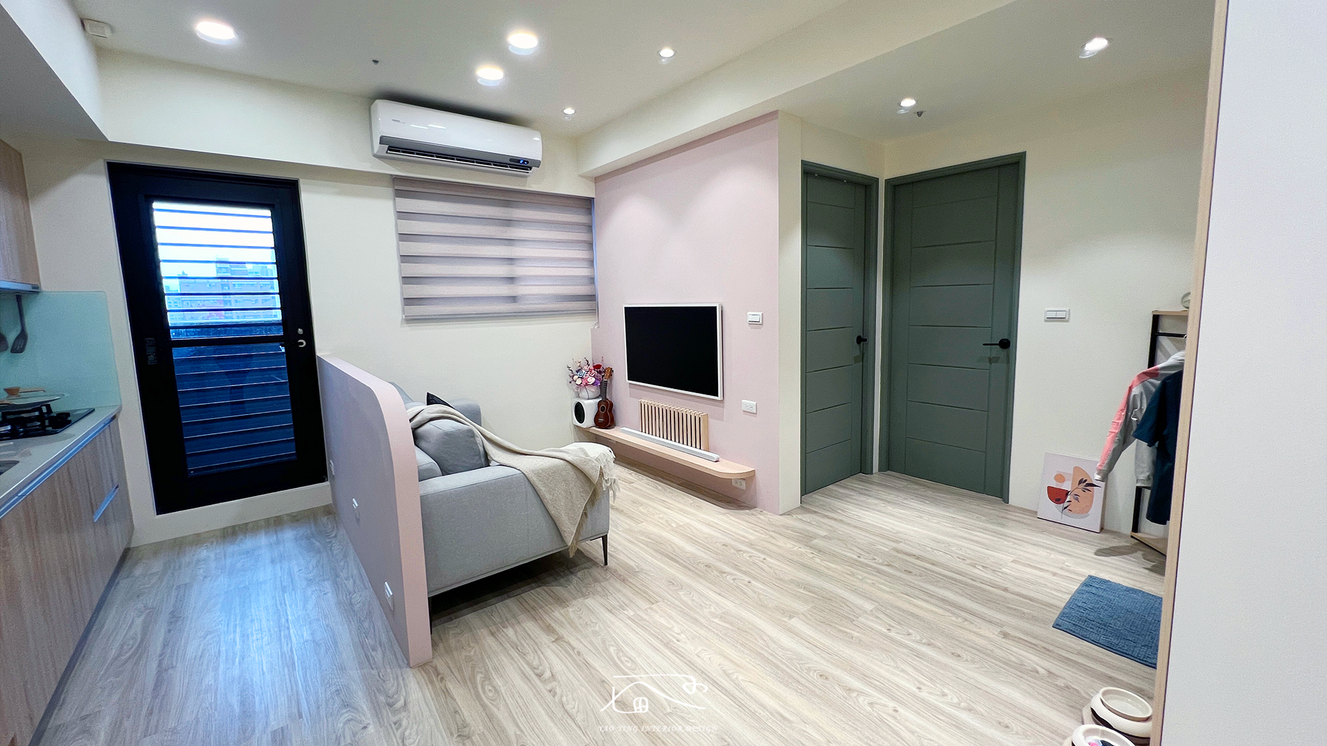 電視牆與沙發背板選用藕粉色系,讓空間多了一份柔和與溫暖感 。