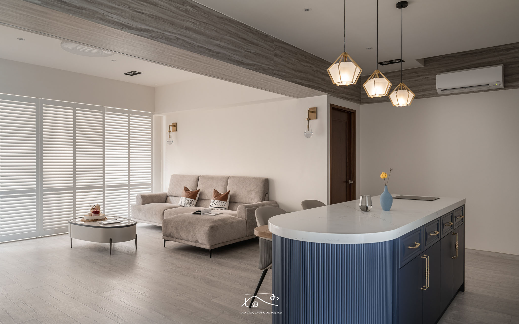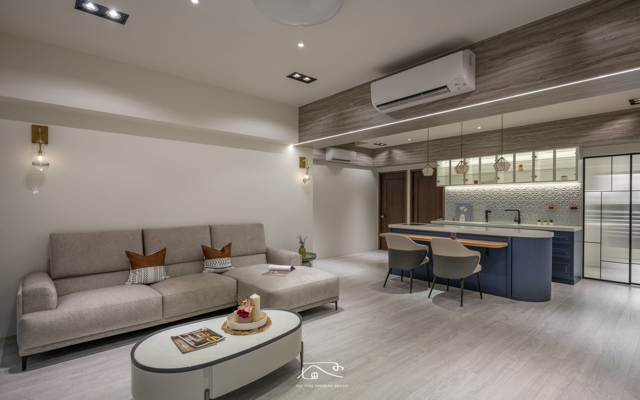 客廳與中島之間運用木皮及線型光,除了化解原始大樑的低迫切割感之外,也運用色調紋路和材質,完美的將電視牆的現代感與中島區的美式風融合在一起,呈現出豐富但又不突兀的mix風格。
