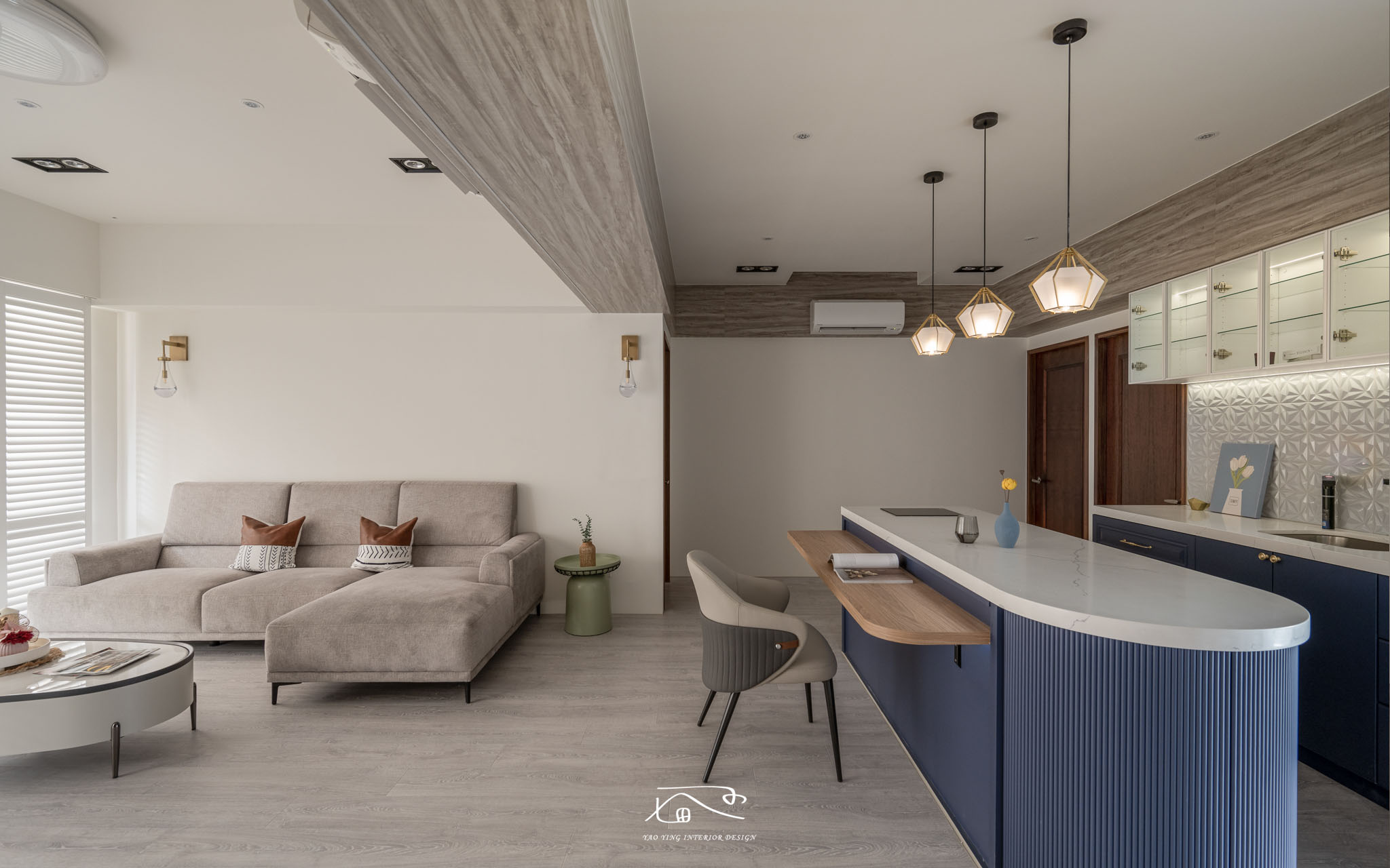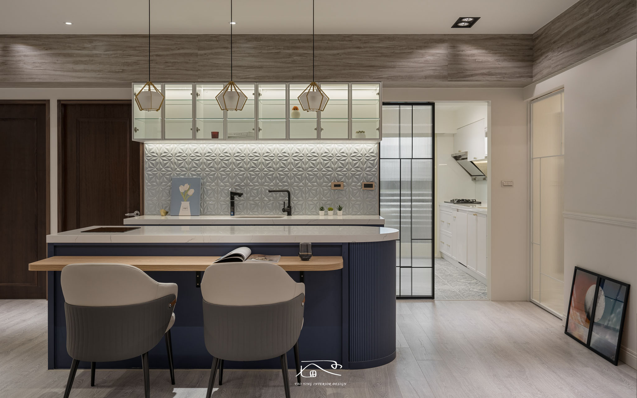 接著進到公領域,中島備餐檯是整個空間的一大重點,除了是輕食區的備餐檯之外,由於屋主只有夫妻兩人,所以並不需要傳統的餐桌,反而是採用愜意的中島餐邊桌來取代。