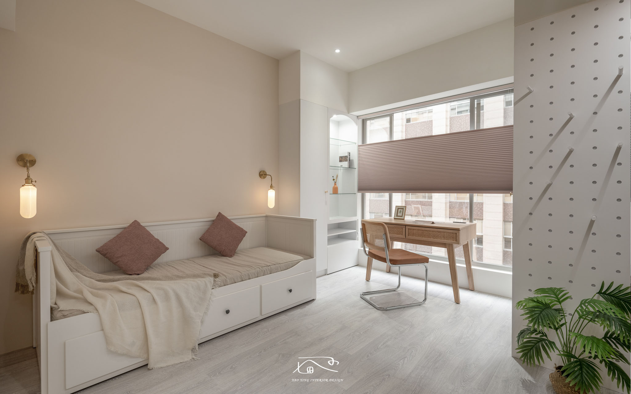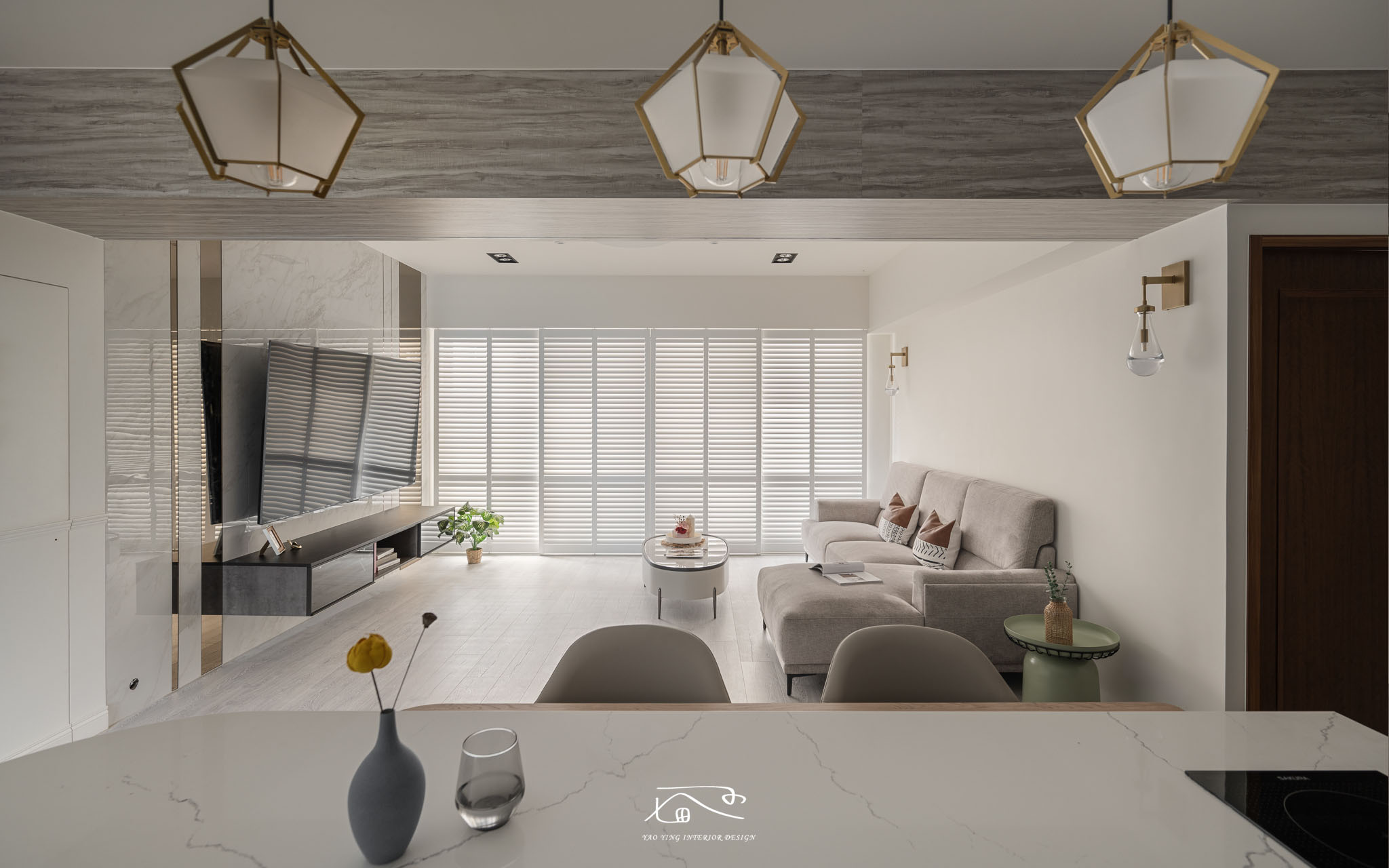 陽光透過百葉門窗的切割,照映出線條光影,營造出室內空間的自然光感。