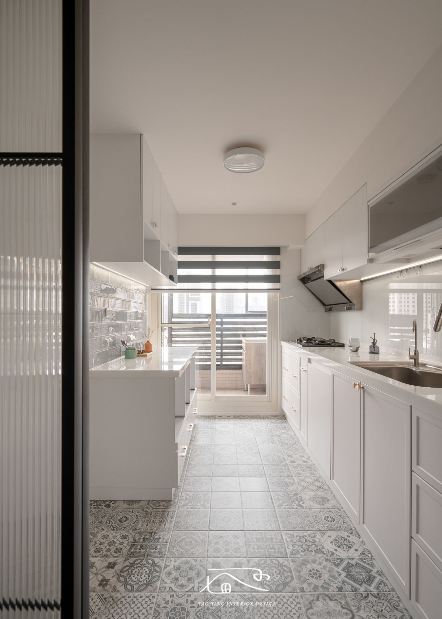 在廚房空間也可以看到完整的美式風格,地磚採用復古花磚,搭配櫃體白色門片在以金色把手、復古花把手來作點綴搭配,讓整體效果更加分;除此之外,在廚房的玻璃拉門的切割造型其實跟二進式玄關拉門是有相呼應的哦!