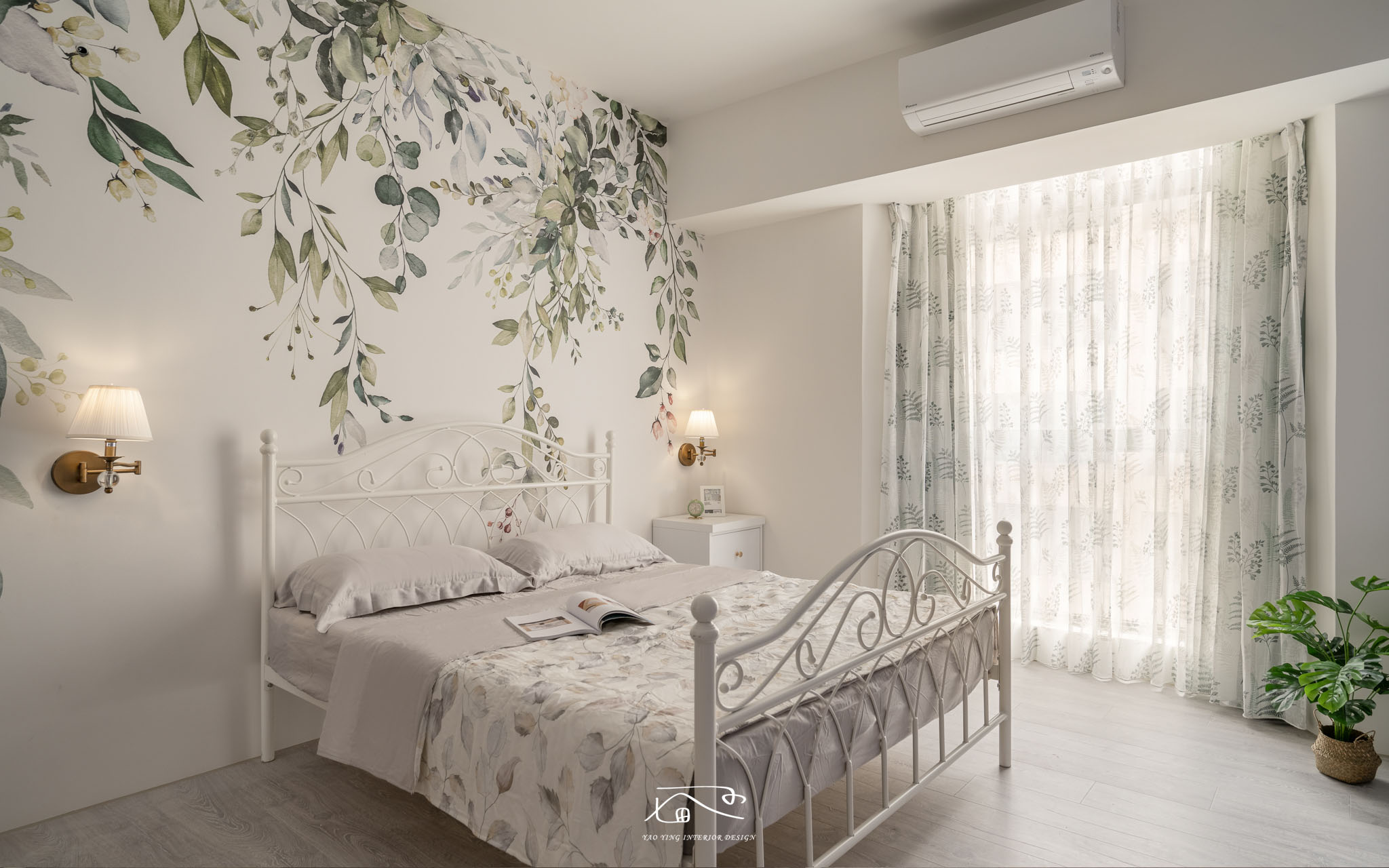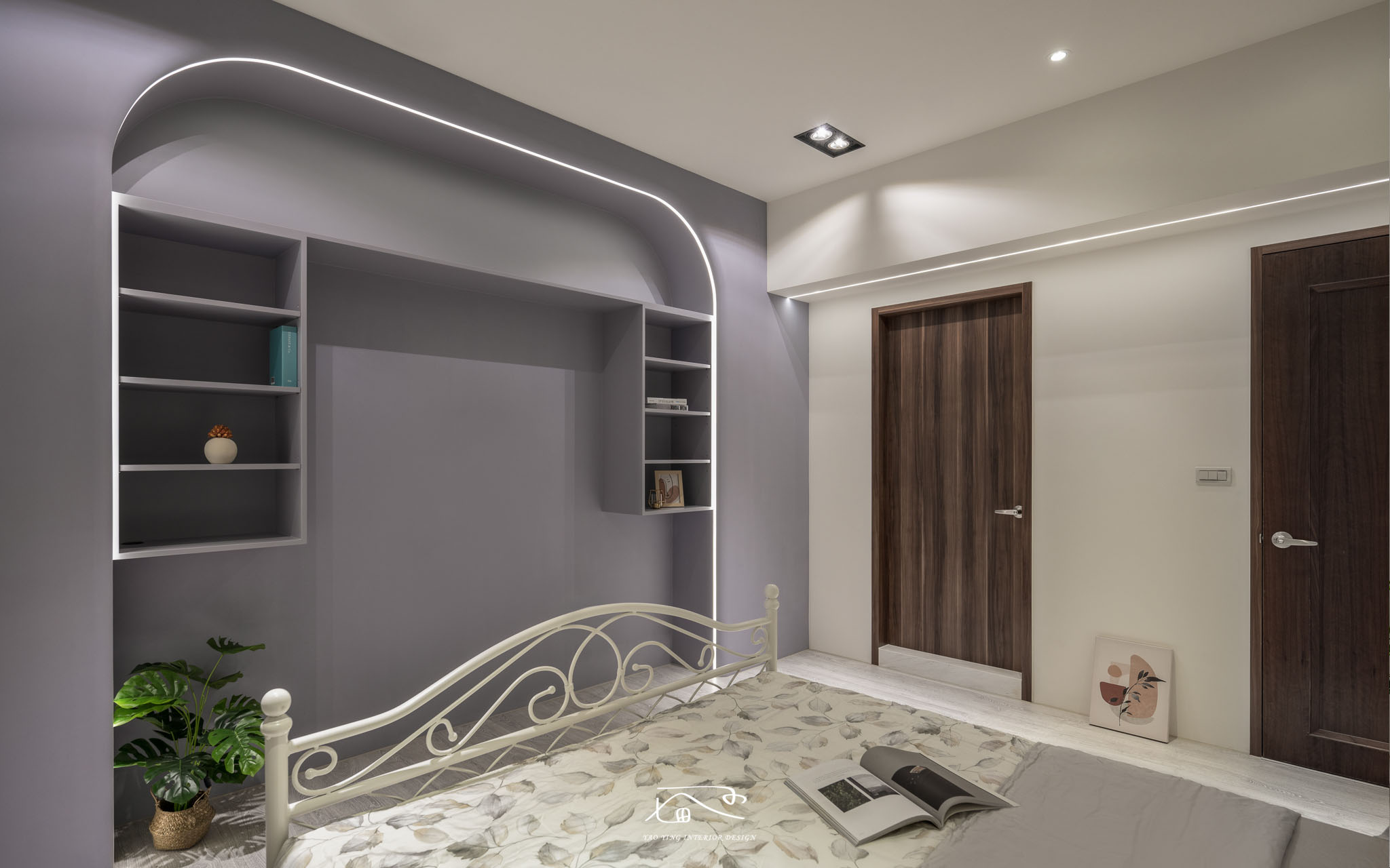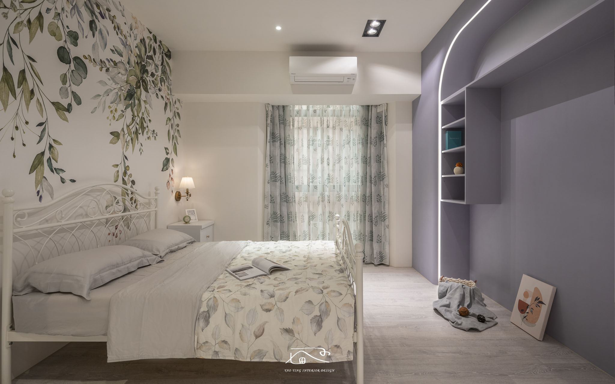 在主臥室床頭採用女屋主很喜愛的壁紙元素,可以看到一進房就是溫和舒適讓人放鬆的感覺,在窗簾上的色系也與床頭壁紙做到呼應,在主臥電視牆的設計延伸了屋主夫妻原本的生活習慣,需要有置物架以及落地音響的空間,也運用此電視牆修飾了大支樑的壓迫感。