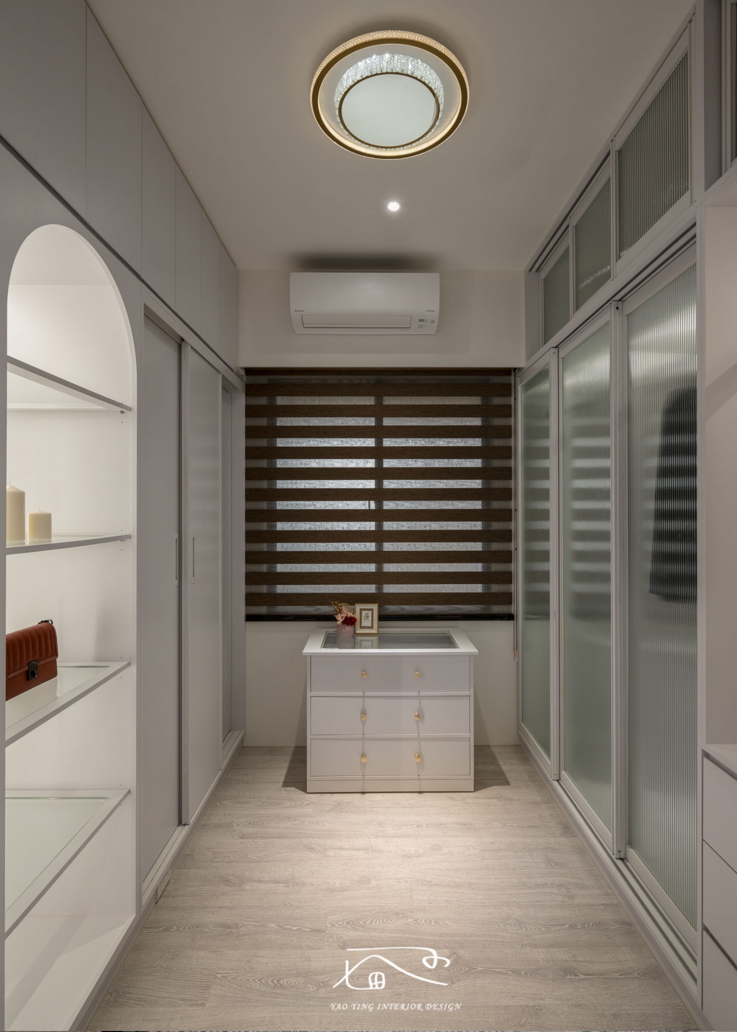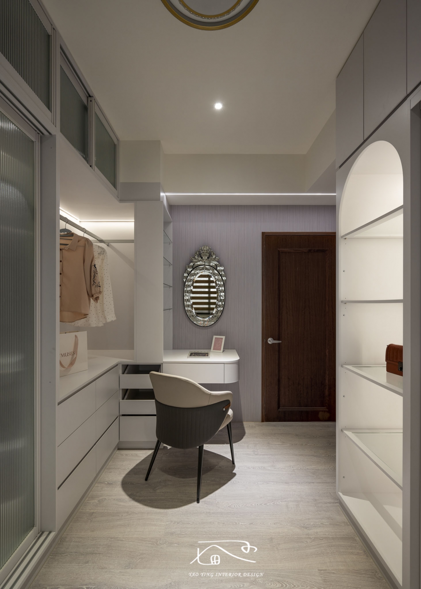 所有女孩夢想中的獨立更衣室,也藏著許多小巧思哦!!依照女屋主的生活習慣打造每一個櫃體的收納空間,以及便利的電器抽屜櫃!!