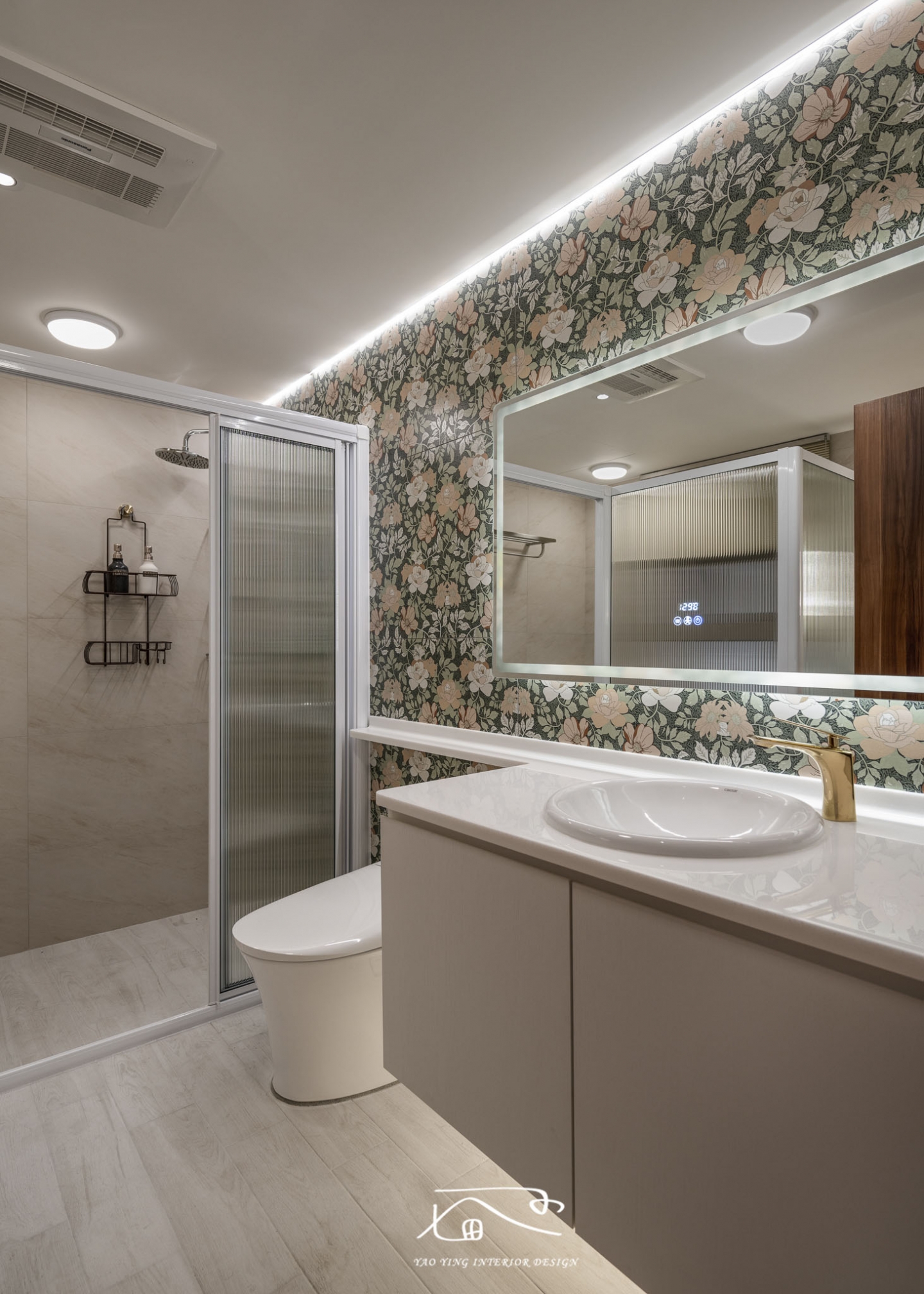 主臥衛浴也打造出如飯店般的高級感受,除了基本的乾溼分離,且擁有浴缸可以放鬆一整天的疲勞,在視覺上採用大面花磚延伸主題牆,以及擁有雙面收納櫃的理想空間。
