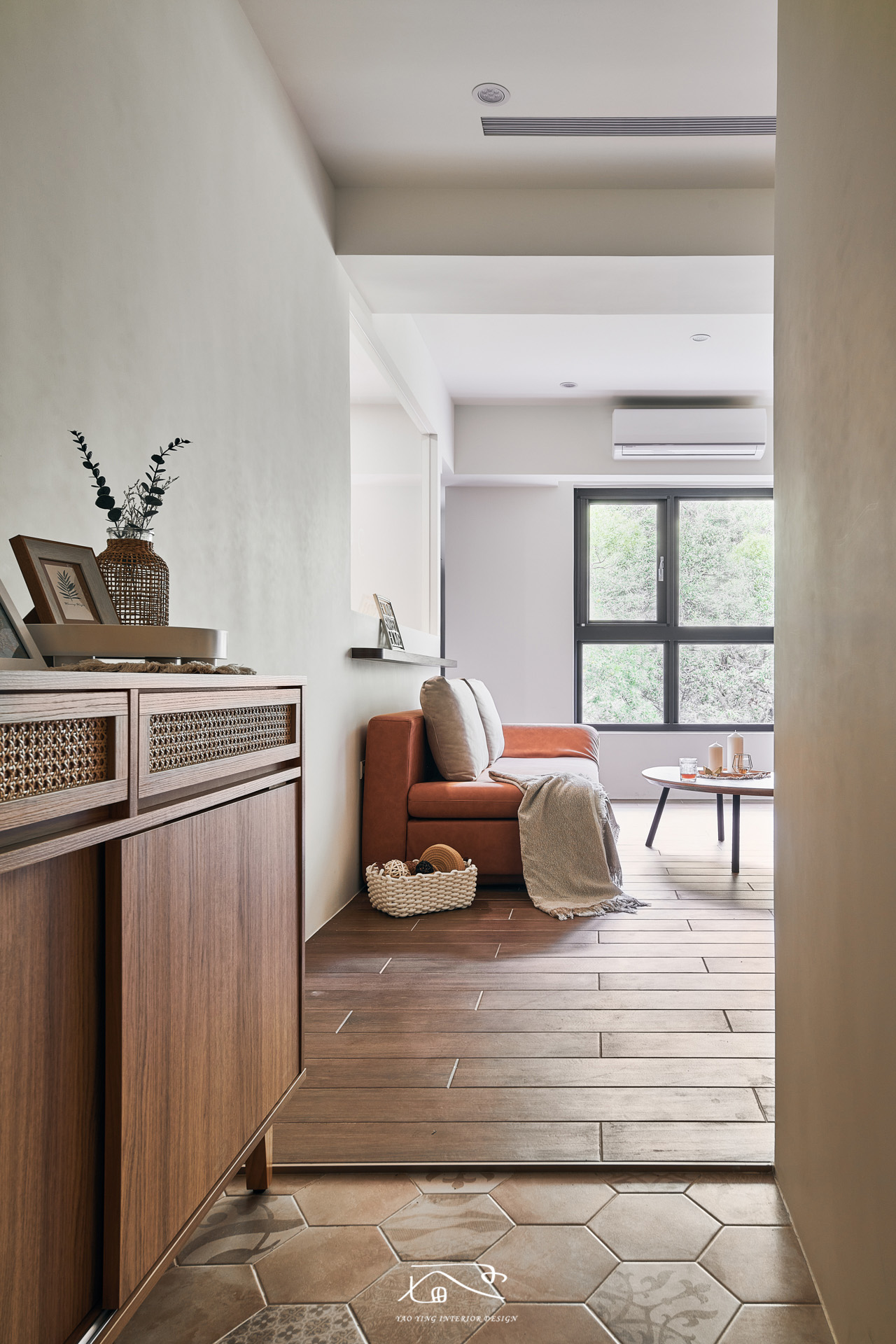 在玄關區設計了落塵區,以復古六角花磚拼貼,讓整體復古味更到位。