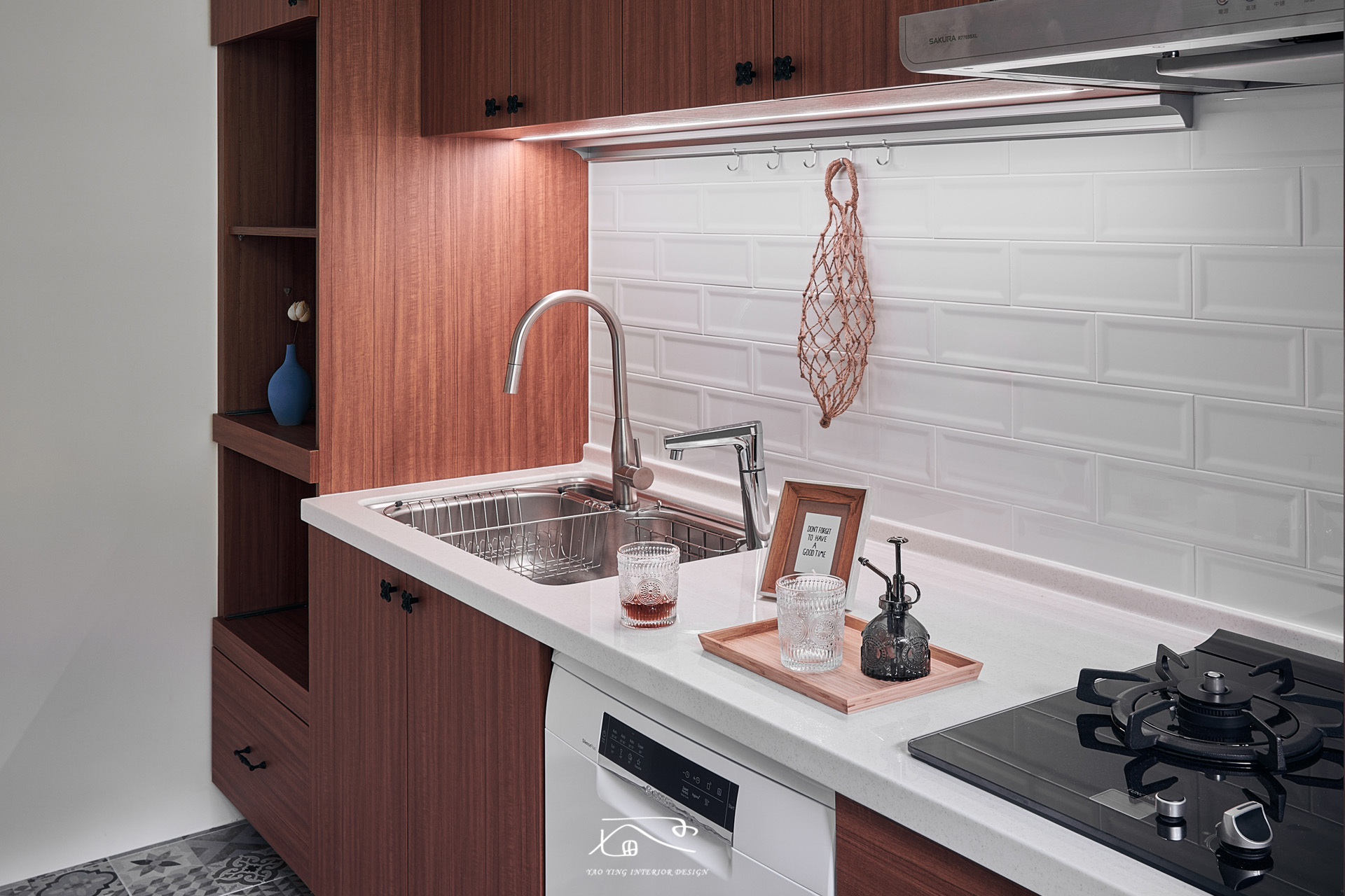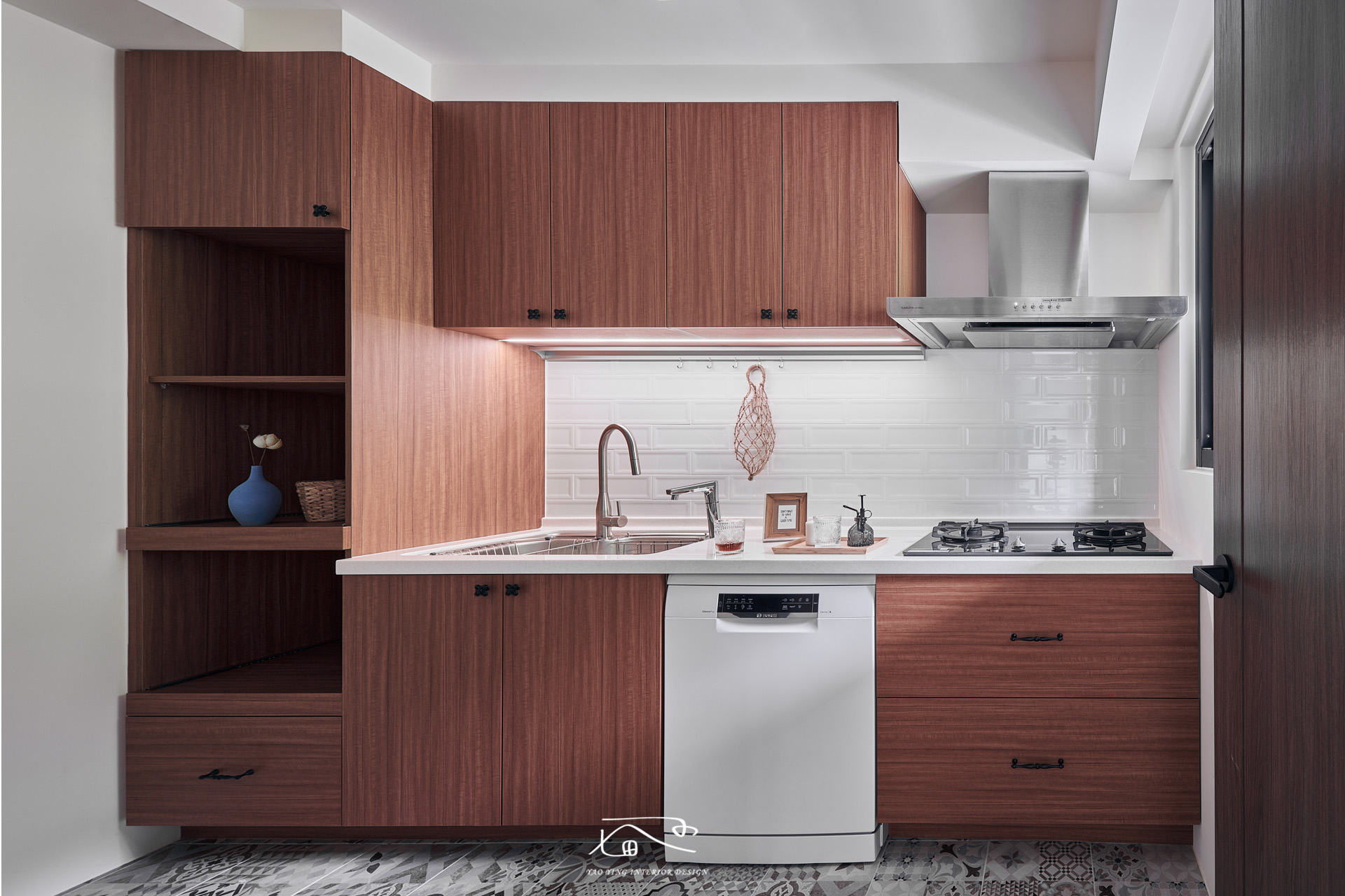 女屋主其一訴求是想要有大大的獨立廚房,我們將原有次臥拆除,改造成獨立廚房,一樣有對外窗,採光通風都非常的棒;在未來如果需要增加收納,在空間上完全可以再加上一字櫥櫃;色系上延伸公領域的風格主軸,在櫃體採用深棕色,地磚選用復古花磚,而廚具中段為了讓整體風格更到位,沒有貼烤玻而是採用了地鐵磚。