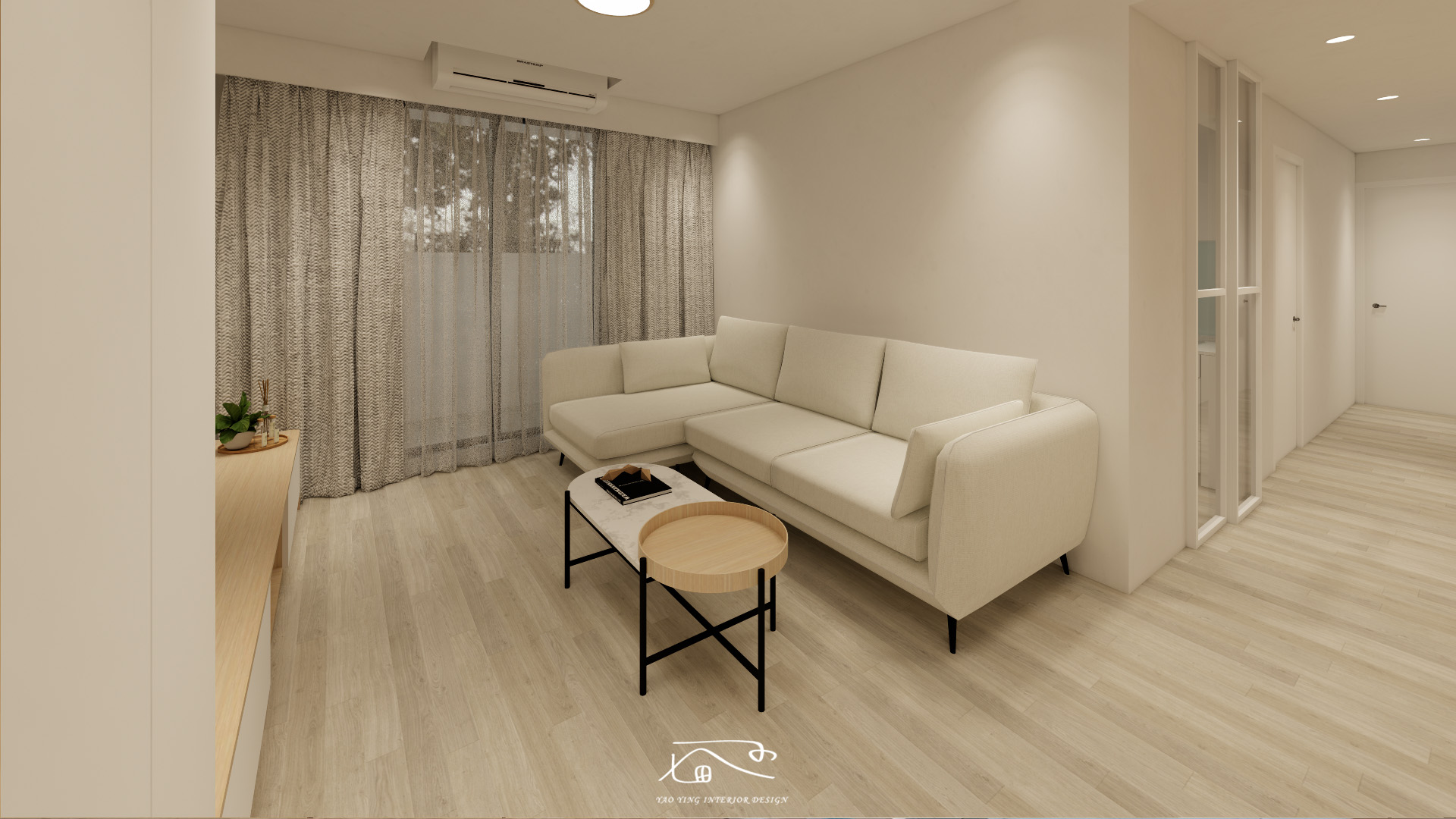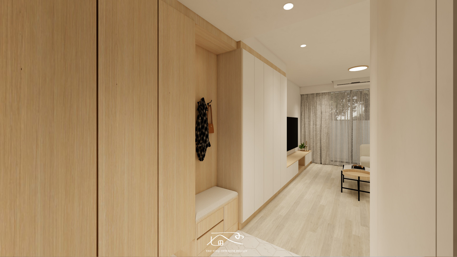 入門玄關右側新增儲物間,左側設計連續性櫃體至客廳,足量收納機能兼具延伸空間視覺感。