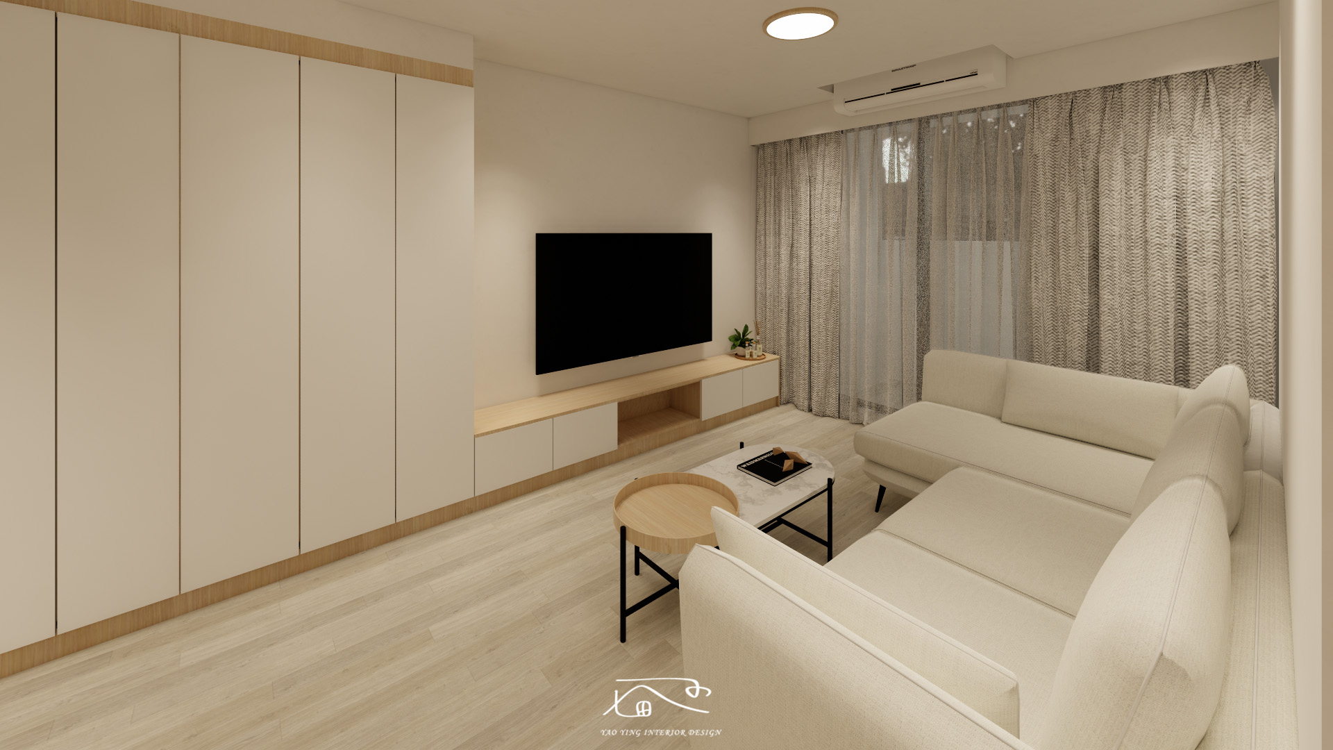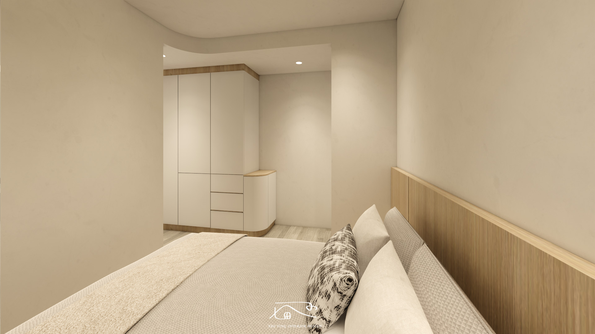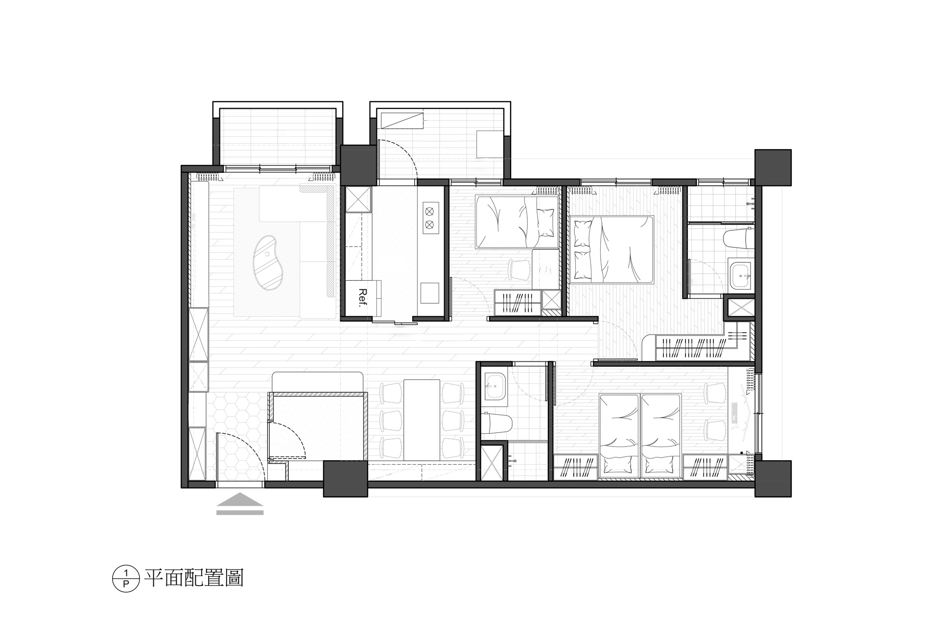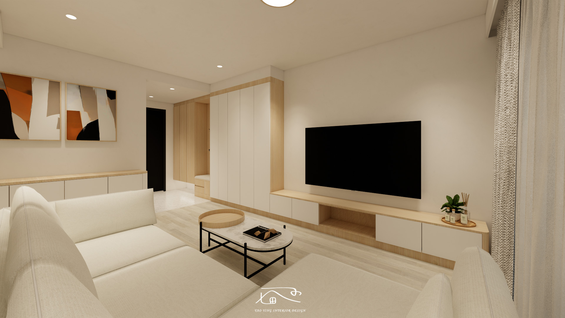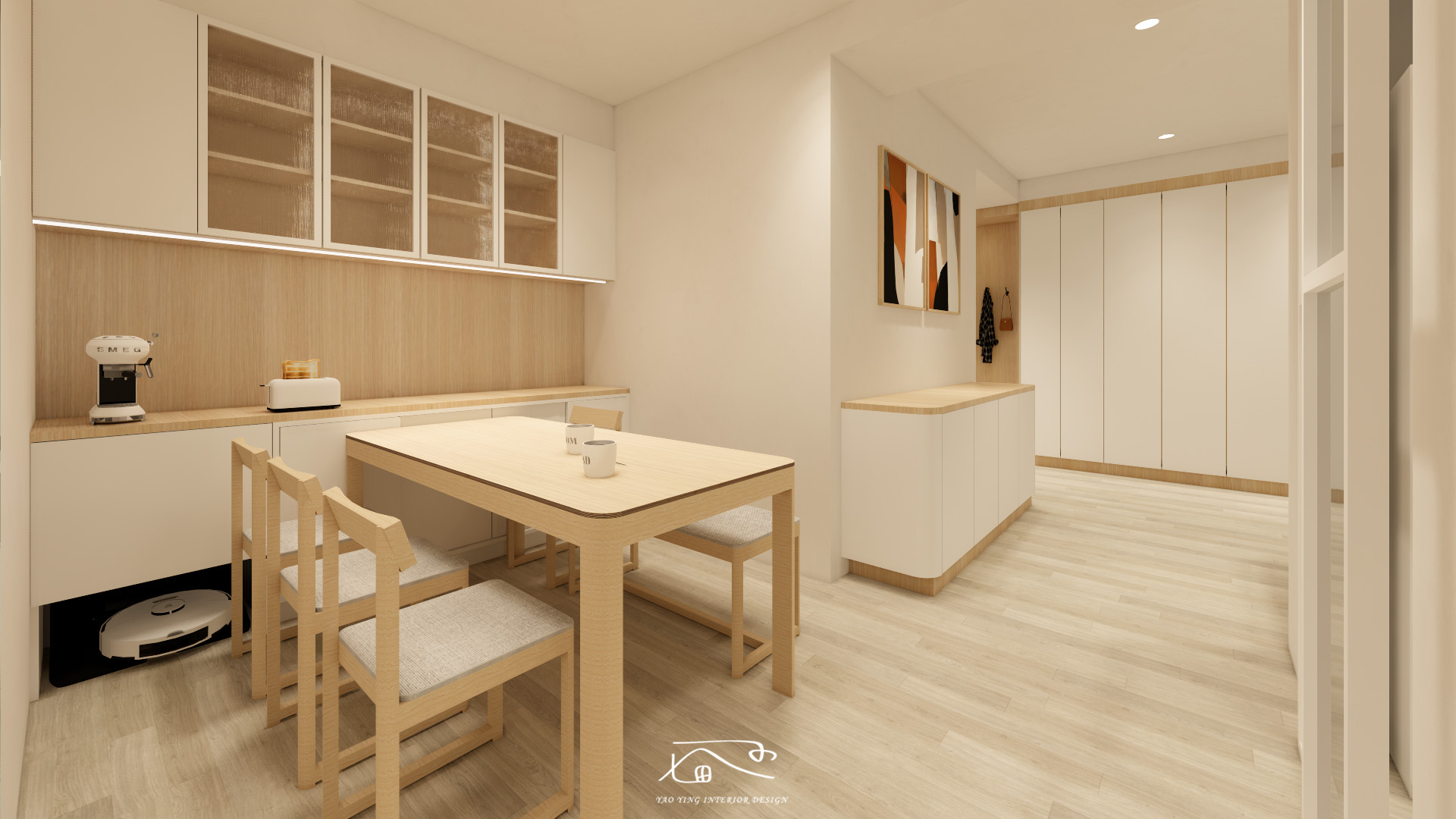 利用了玄關空間再多隔出一個儲物間,為了不遮擋過多的視線,在儲物間的深度特別作計算,而多出來的過道空間增加了收納矮櫃,消除了進門的視覺壓迫感,在公領域的收納空間設計上非常足夠一家四口使用,且也將小小孩未來上學會使用到收納空間與習慣都考量進設計;未來長大後原有的收納設計也都是可以多變化的依照屋主習慣來做使用;而在私領域空間上則是保留了許多彈性。