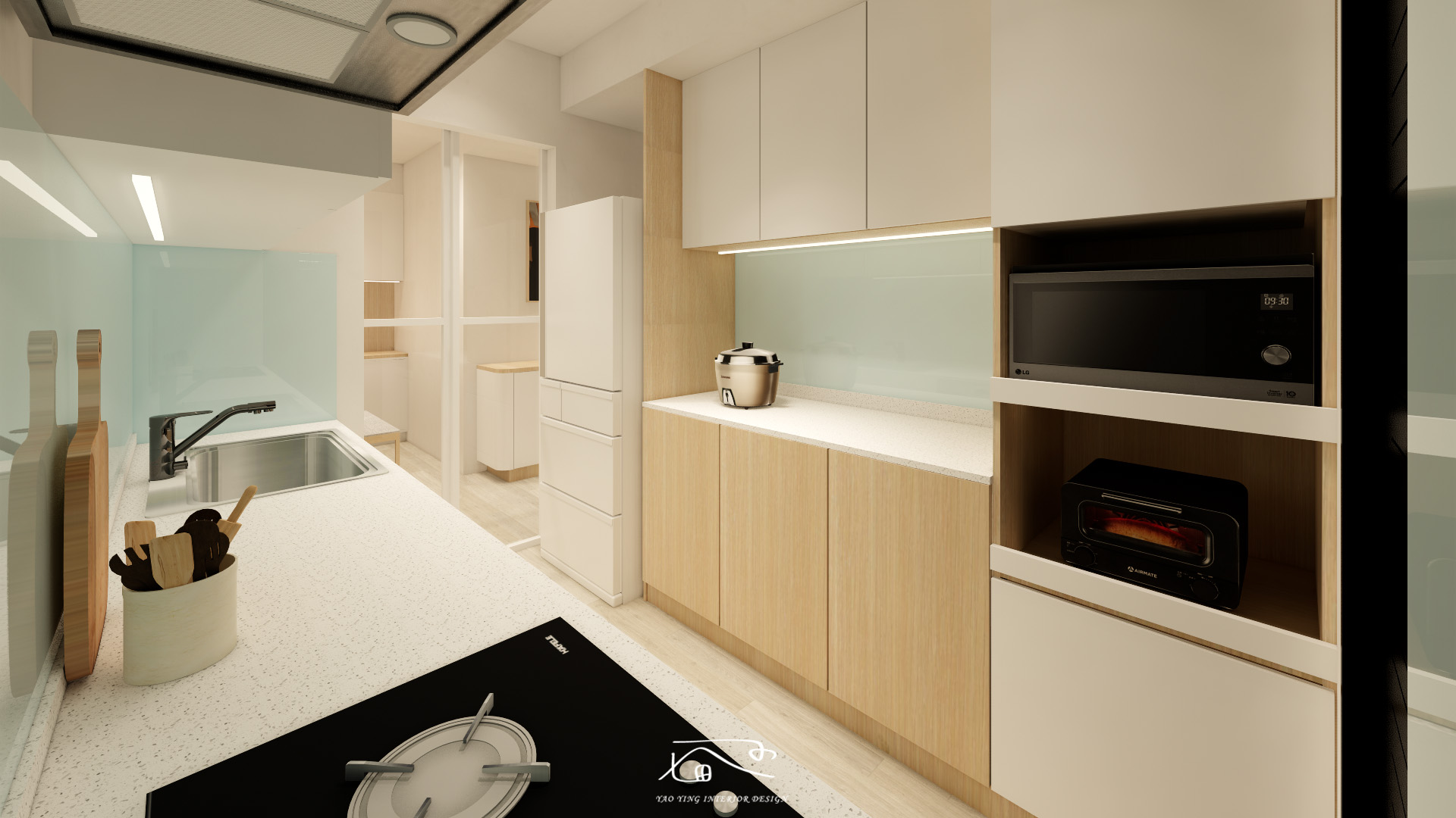 除原有建商附設廚具,因應業主下廚使用習慣,增添備餐平台及電器櫃。